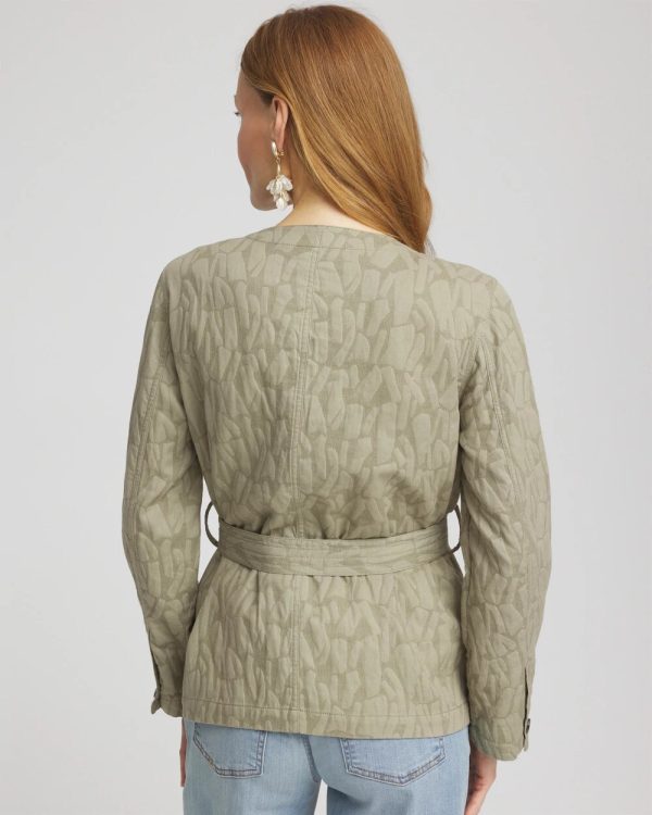 Crafted with cotton-linen gauze, this field jacket features two patch pockets, side pockets, a silhouette-defining self-belt, and a collarless neckline. Sumptuous fabrication adds a luxurious touch, while inner lining snaps provide signature style.