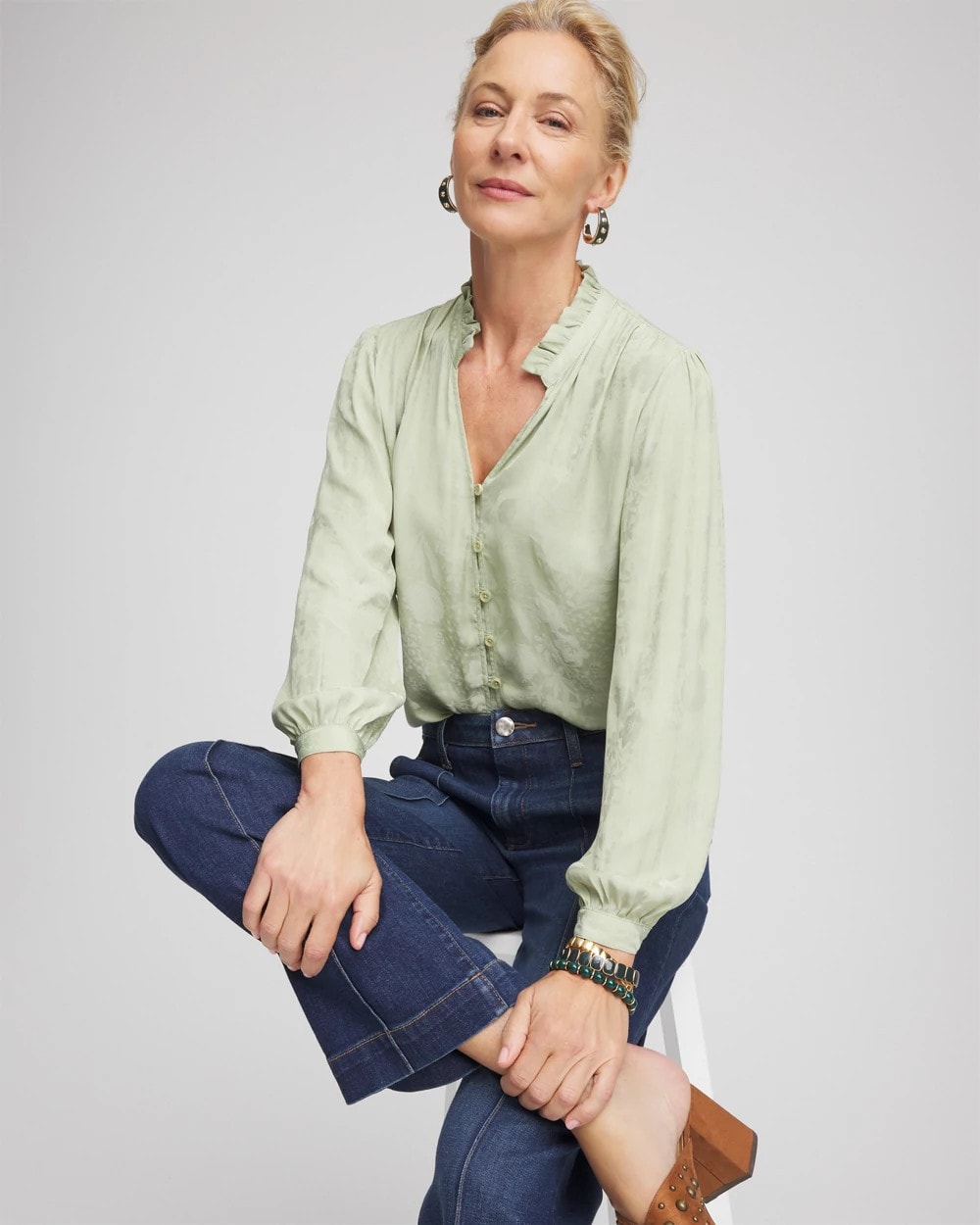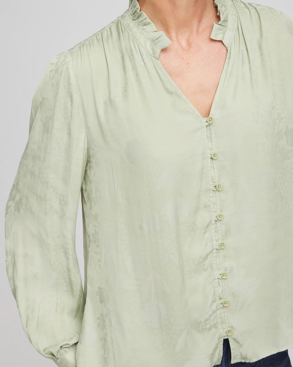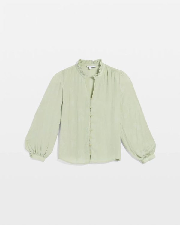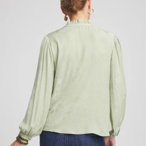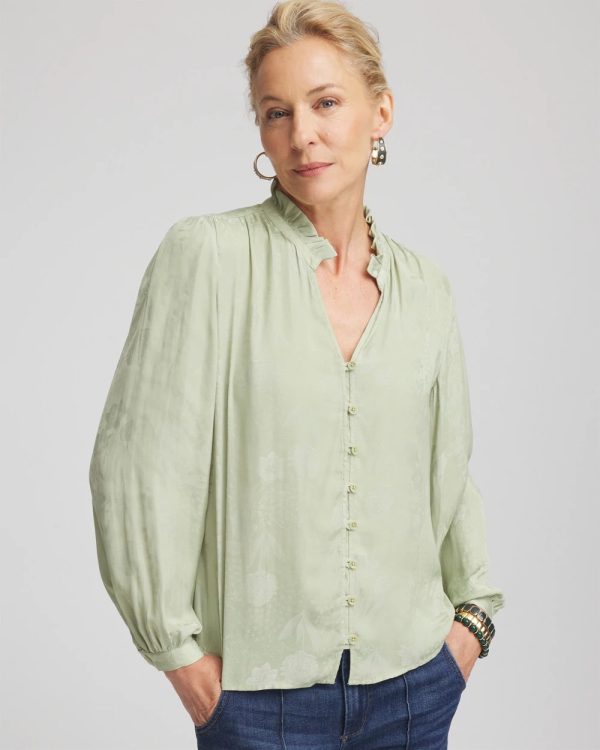 A romantic ruffled collar and intricately designed button-front placket help define this Jacquard Georgette Peasant Blouse showcasing a pressed floral jacquard fabrication for added dimension and style.