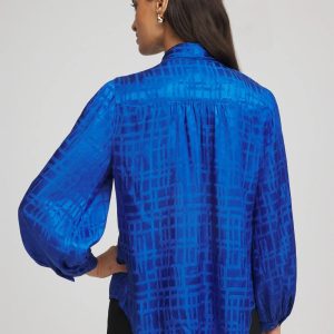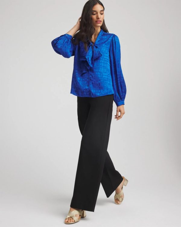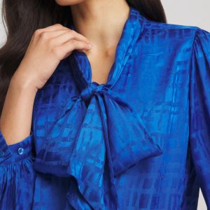 Infused with romantic style, this Jacquard Tie-Front Blouse is cut from luxurious fabric in glamorous cobalt blue. Featuring a tie-front neckline, luxurious lining, and blouson sleeves. Pair this elegant style with jeans or cropped pants to strike a casual balance, Emme, Brigitte, or Juliet pants for a more upscale style.