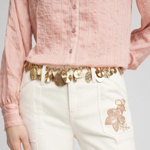 - Gold-tone chain belt with organic leafy charms and a lobster claw closure.