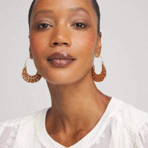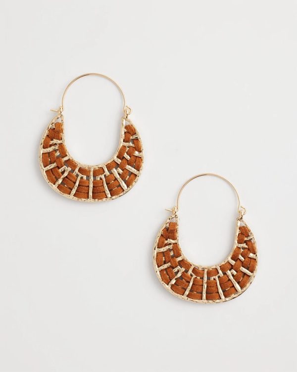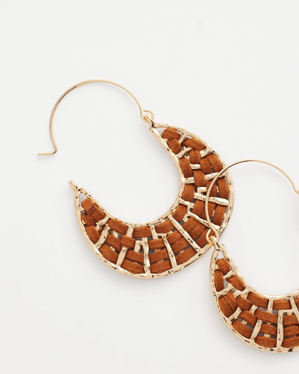 Half-moon hoop earrings showcasing the natural luxury ofleather and rich. metals help define these high-style earrings. Featuring Chico’s proprietary No Droop® technology to create statement styles without the weight on your earlobes.