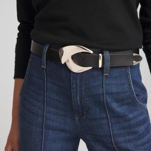 An angular, fashionable buckle in gold tones against a sleek black leather strap help define this Chico’sLeather Trouser Belt.