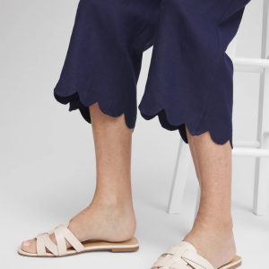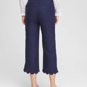 The perfect cropped pants for long walks on the beach that also transition seamlessly for getting dressed up for evening get togethers. They feature a fly-front, elastic back waist, front pockets, and faux back welt pockets. Complete the look with the scallop edge linen jacket.