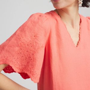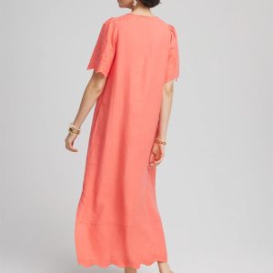 The Linen V-Neck Maxi Dress has easy, party-going style. Showcasing beautiful eyelet details on the hem and cuffs, short fluttery sleeves, and a v-neckline.