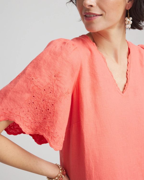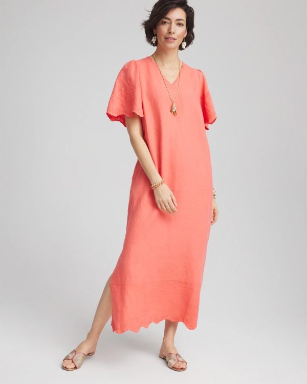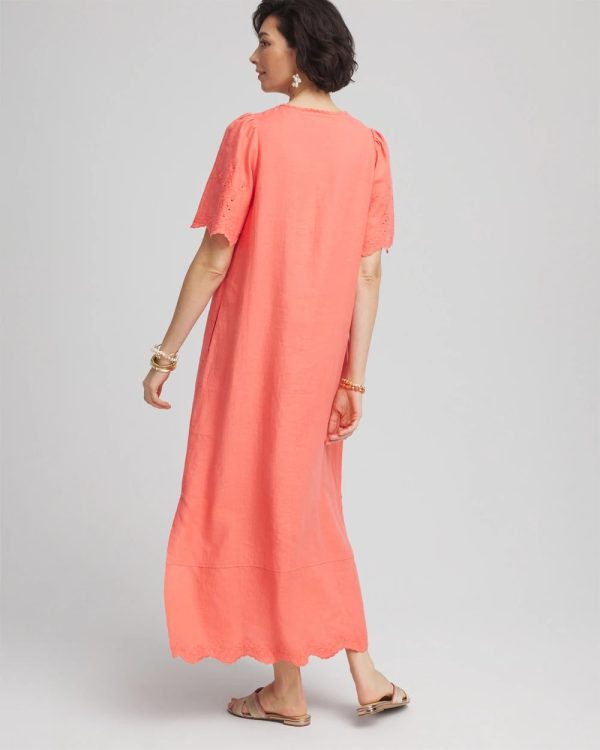 The Linen V-Neck Maxi Dress has easy, party-going style. Showcasing beautiful eyelet details on the hem and cuffs, short fluttery sleeves, and a v-neckline.