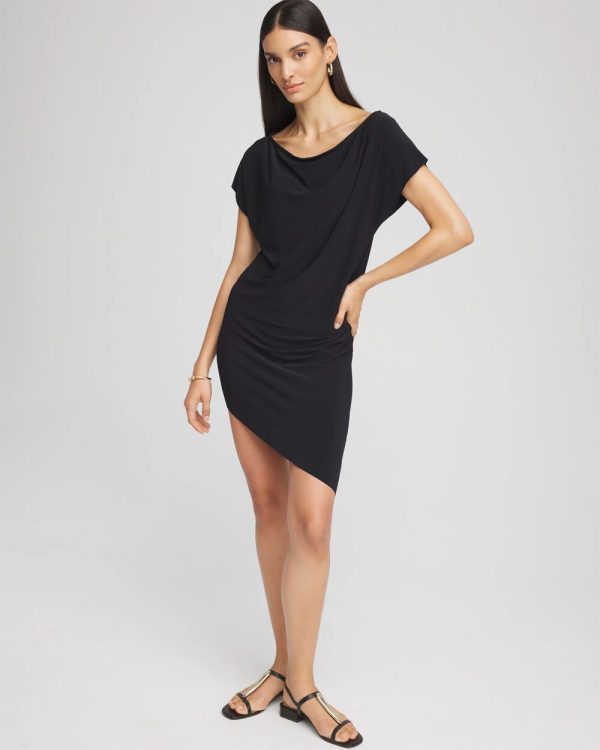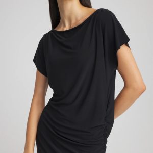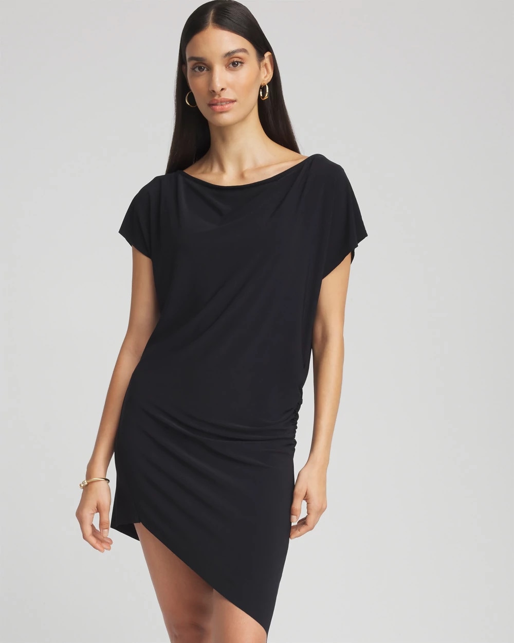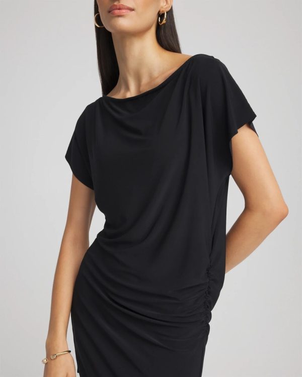 - Slight shirring at the hipline creates chic camouflaging.