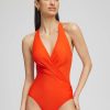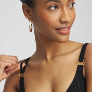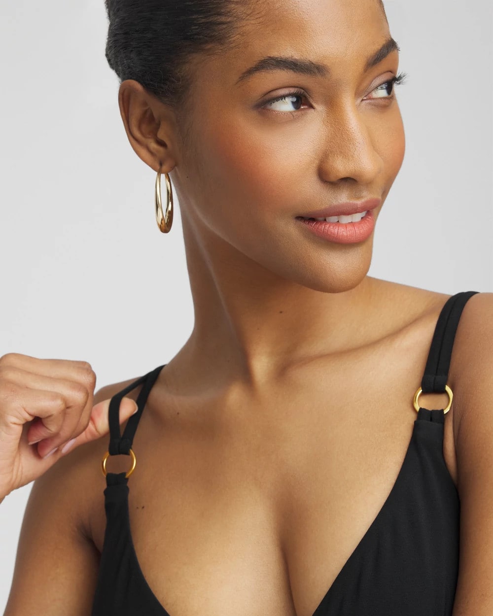 - V-neckline, adjustable tie front, sleek ring hardware at straps.