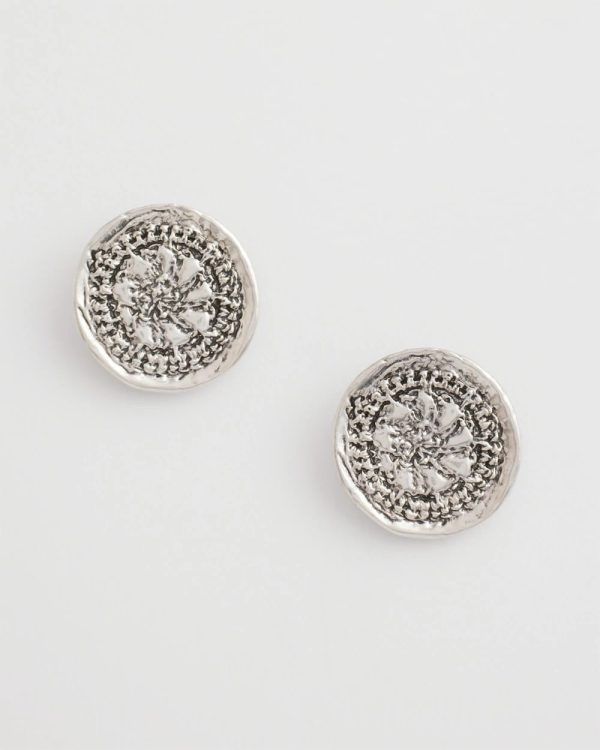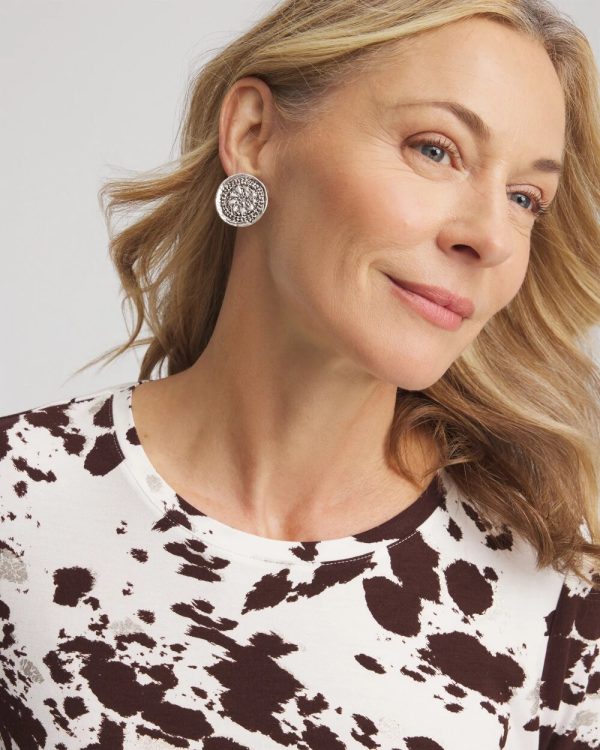 The perfect retro earrings to match along with the necklaces and ring. Textured antique-style silvertone medallion formed into stunning clip-on earrings. Inspired by ‘the Paris of the South’ Argentinian high-style. Mix and match with jewelry from Chico’s Rancho Renaissance Collection.