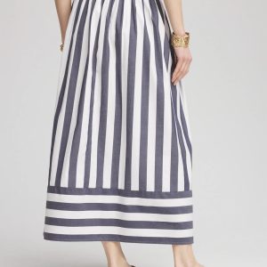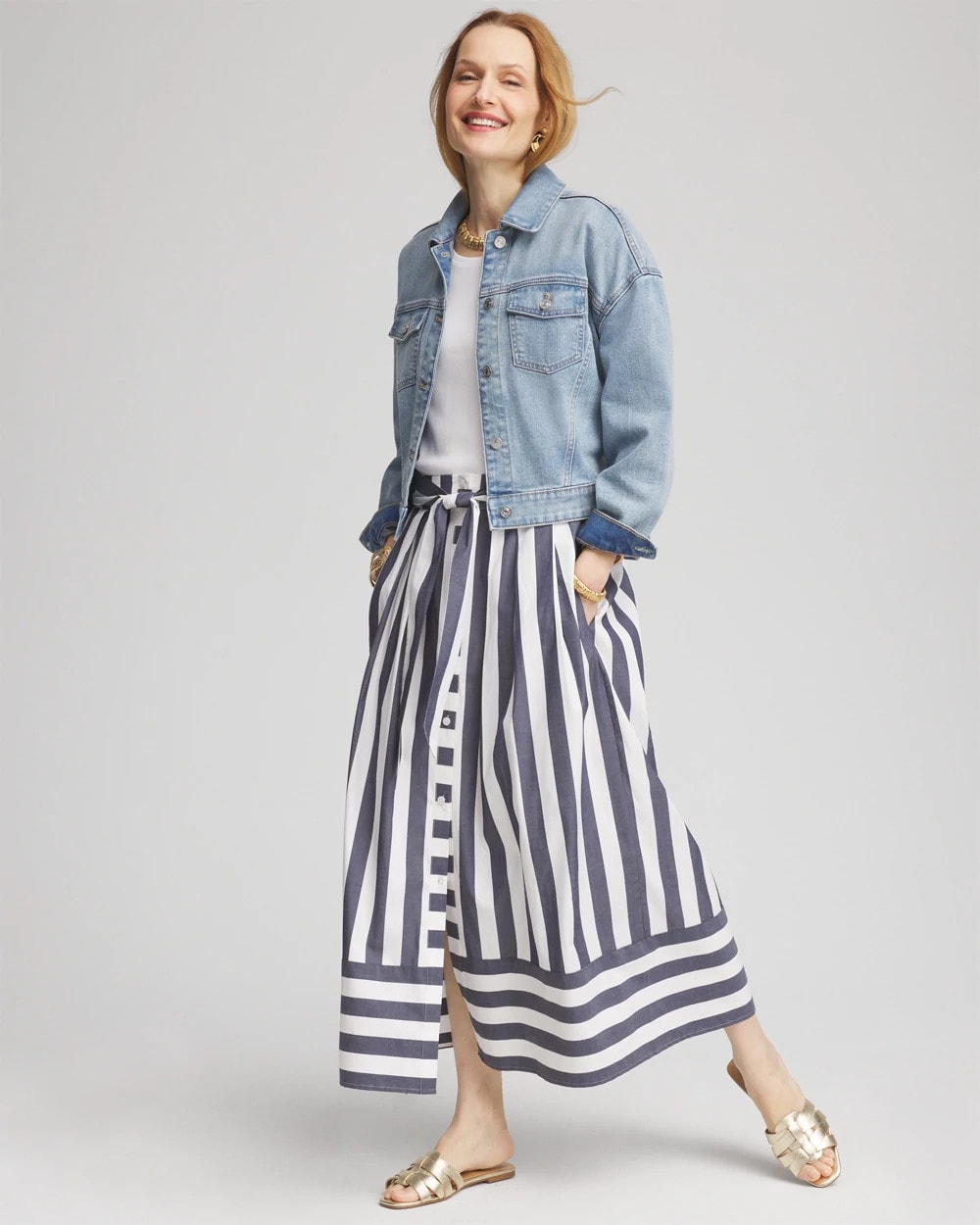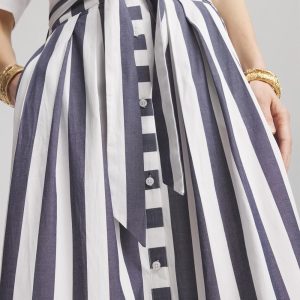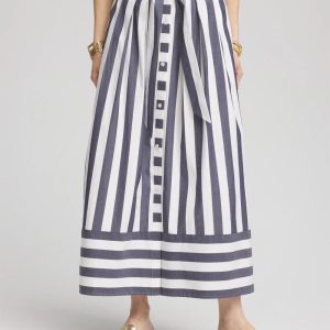 Featuring a button-down front, elastic waist with a tie-front. Flawless fit elastic waist with a stylish combination of horizontal and vertical stripes. Showcasing a relaxed silhouette, you will love the way you look and feel in this midi length skirt.