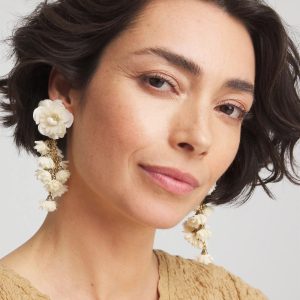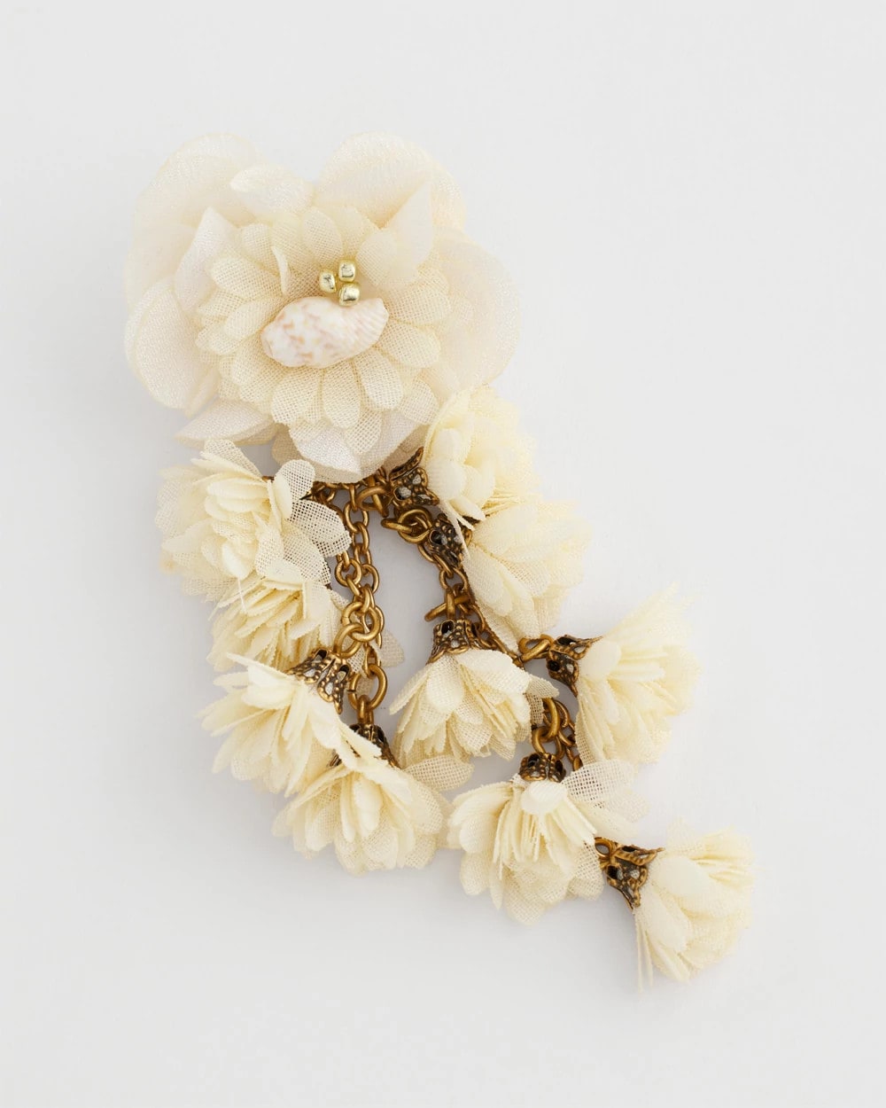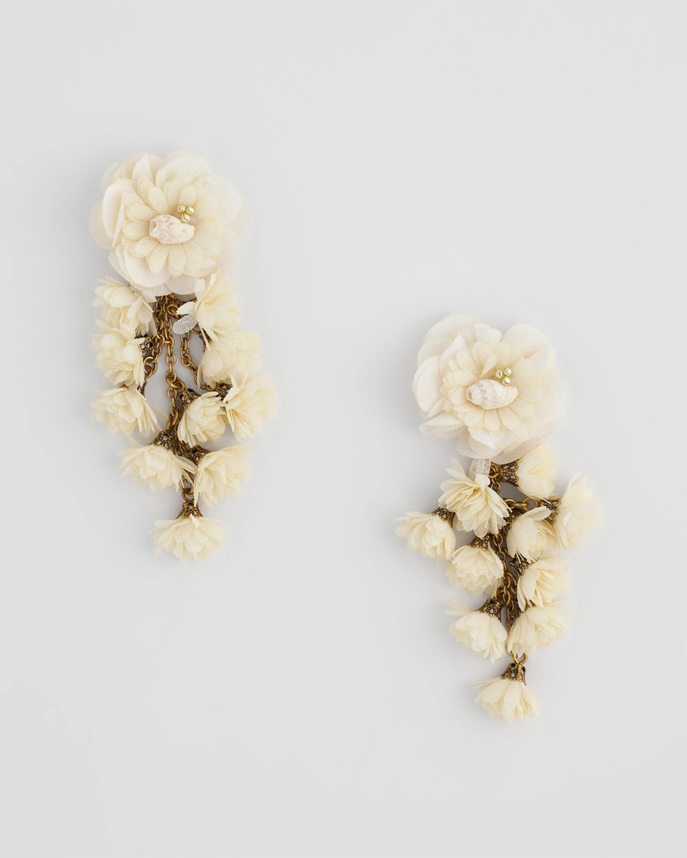 This style includes an elegant chiffon-inspired fabrication creates a flowing cascade of flowers topped with a genuine mini-conch shell and pearl-like beading. Chico’s exclusive No Droop® technology creates all the style without the weight in these three inch, post-back, linear drop earrings.