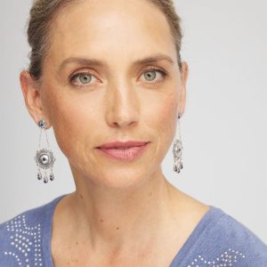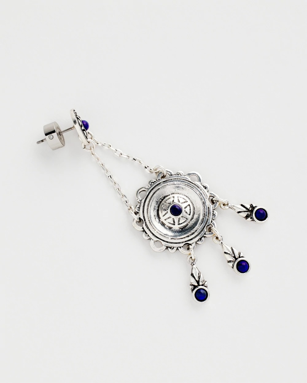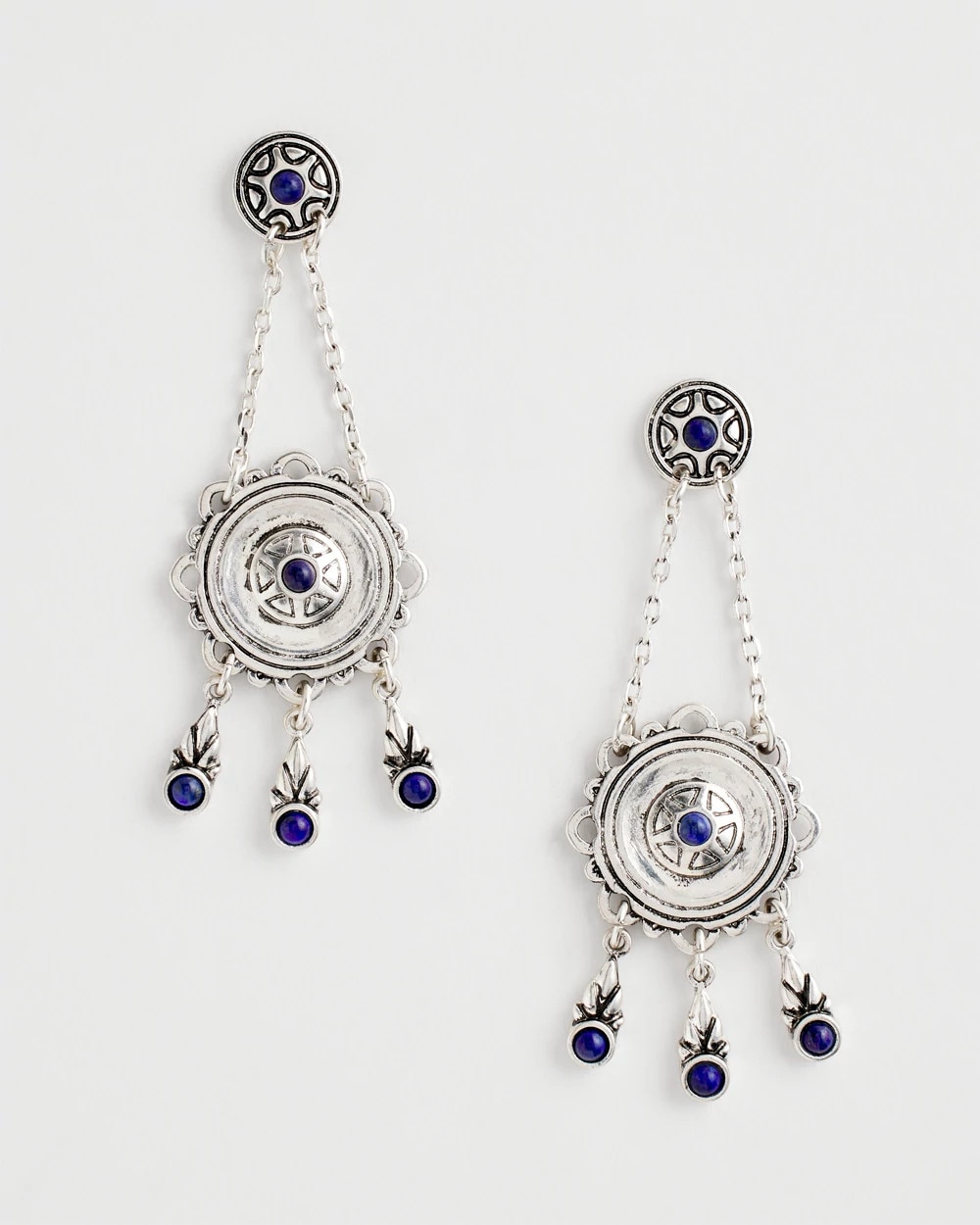 Bohemian-inspired medallion drop earrings merge with the royalty of lapis lazuli stone and platinum-inspired silver tones to create these high-style earrings. Featuring Chico’s proprietary No Droop® technology to create statement styles without the weight on your earlobes.