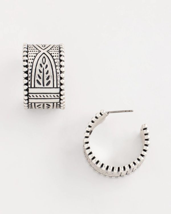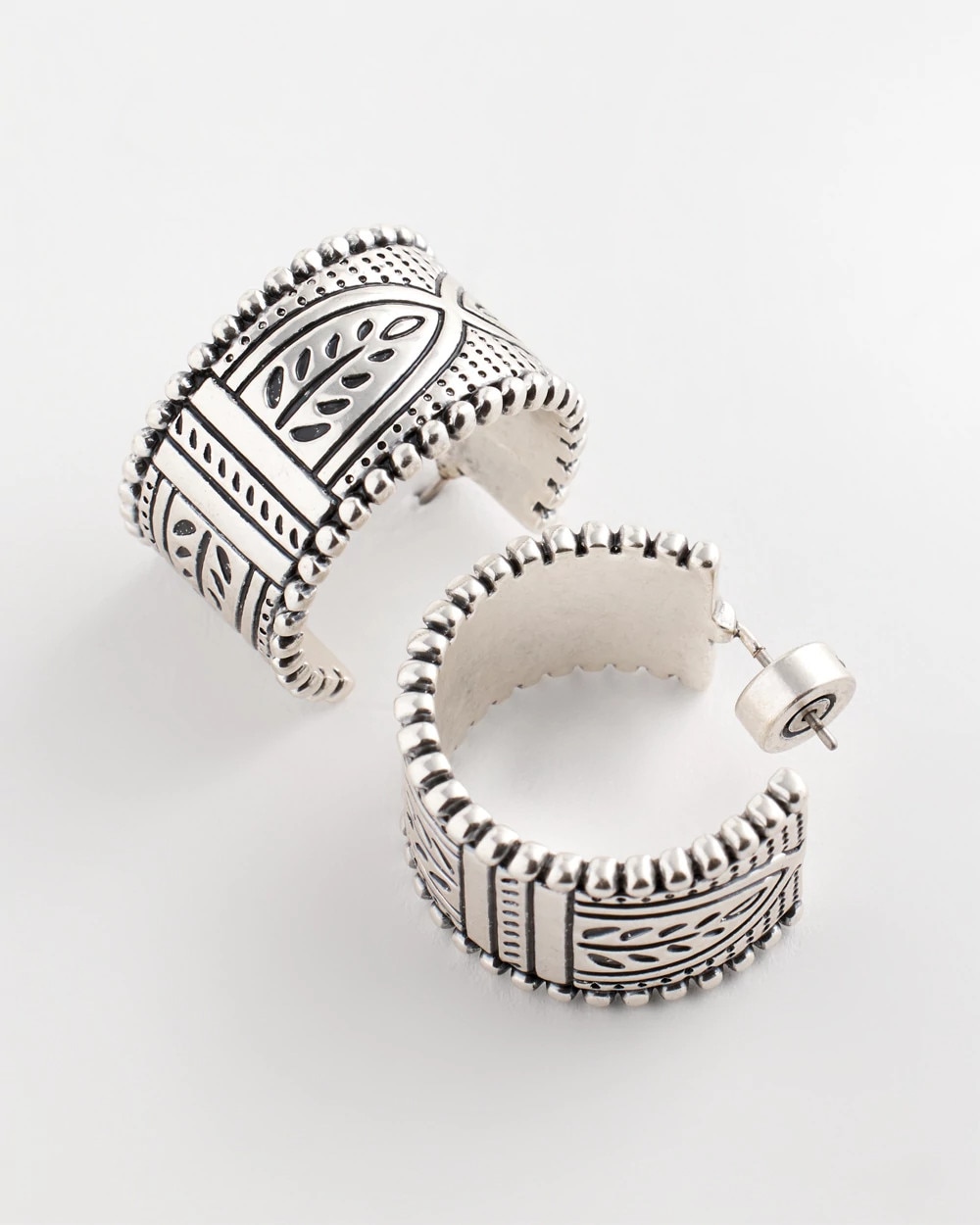 An antique silver motif and inspired design help define these wide silvertone hoop earrings.Featuring Chico’s proprietary No Droop® technology to create statement styles without the weight on your earlobes.Part of our Rancho Renaissance Collection, pair with matching necklaces, rings, and bracelets.