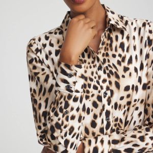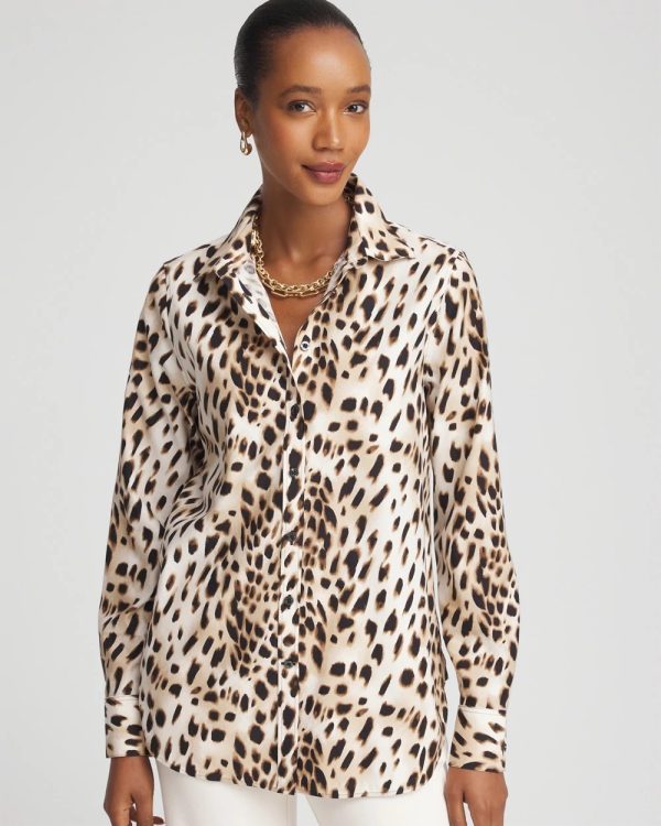 Our instantly bestselling No Iron™ Shirt showcasing a playful cheetah print in a rich neutral palette. We can’t keep our classic-fit No Iron™ stretch-sateen shirts in stock. This ready-to-wear right out of the dryer (without the hassle of ironing) top moves with you effortlessly for all-day comfort. It’s a straight silhouette with a point collar. Flawless every time in any season, whether on its own or as a base layer. Designed with a flattering shirttail hem and gusset featuring our CC Chico’s logo. This button front pairs perfectly with jeans, skirts, or pants.