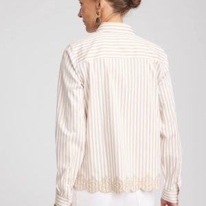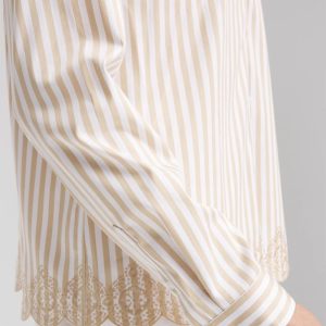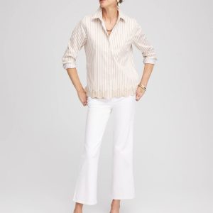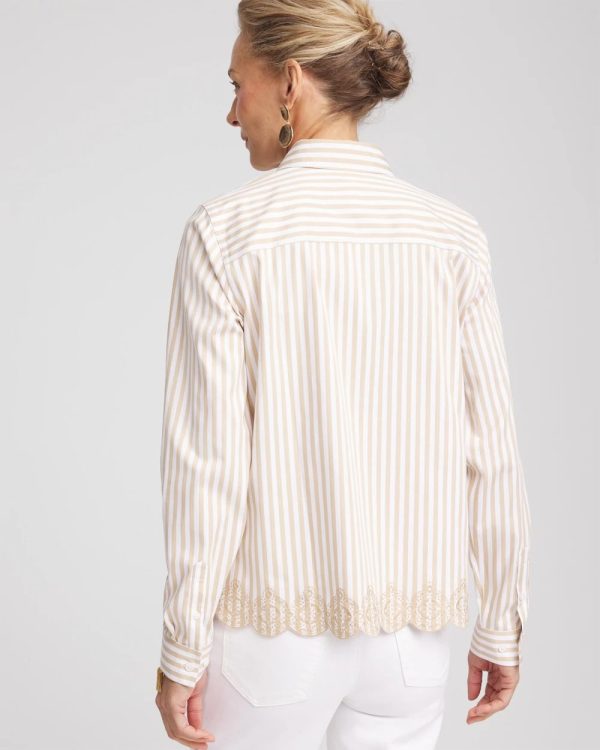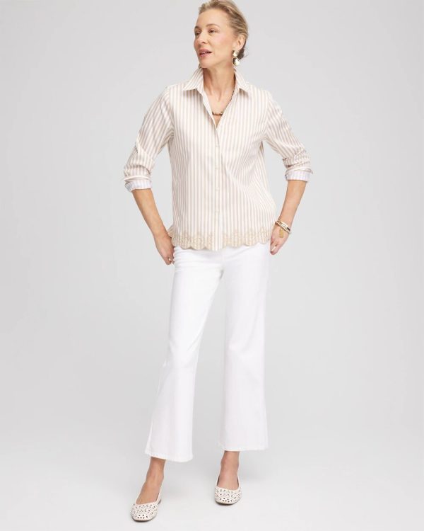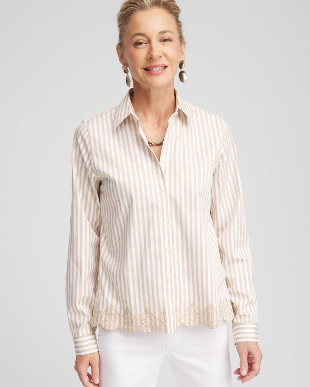 You will love our newest No Iron™ iteration featuring a feminine scalloped hemline. It’s no wonder we can’t keep our No Iron™ sateen shirts in stock. This ready-to-wear right-out-of-the-dryer (without the hassle of ironing) top moves with you effortlessly for all-day comfort. It’s a perfect fit every time in any season, whether on its own or as a base layer. Designed with a flattering scalloped hem and timeless striped print, this button front pairs perfectly with jeans or pants.