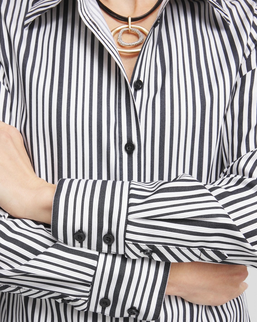 New Shimmer Stripes Shirt in our coveted No Iron™ fabric, made to defy wrinkles and stay fresh from the dryer to the end of your festive holiday party. There’s a reason why our No Iron™ top is a five-star rated, bestselling customer favorite. It moves with you for all-day comfort and stays looking brand new without the effort of ironing or dry cleaning. It’s the perfect shirt in any season, whether on its own or as a base layer. Designed with a sharp-looking shirttail hem and stripes with lurex design, this button front pairs with jeans or pants. Available now in new animal prints, paisley, graphic prints, and more!