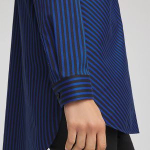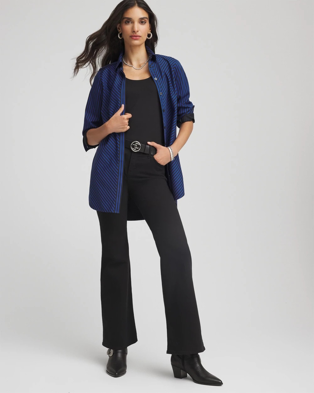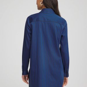 Our instantly bestselling No Iron™ Tunic showcasing a slimming striped print in rich seasonal hues. We can’t keep our classic-fit No Iron™ stretch-sateen shirts in stock. This ready-to-wear right out of the dryer (without the hassle of ironing) top moves with you effortlessly for all-day comfort. It’s a straight silhouette with a point collar. Flawless every time in any season, whether on its own or as a base layer. Designed with a flattering shirttail hem and gusset featuring our CC Chico’s logo. This button front pairs perfectly with jeans, skirts, or pants.