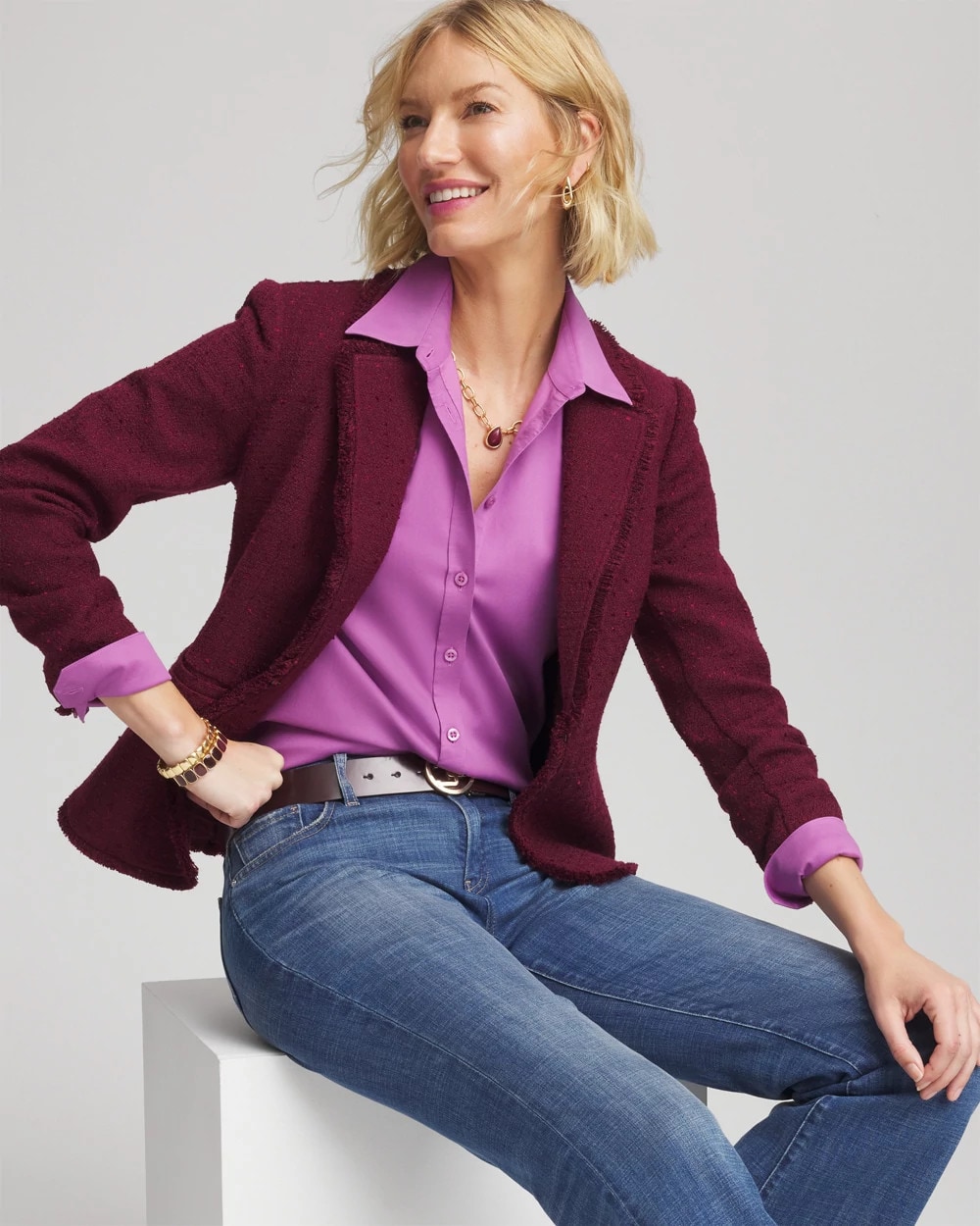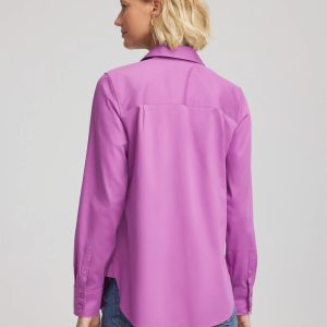 Our instantly bestselling No Iron™ shirt showcasing the season’s most coveted hues. We can’t keep our classic-fit No Iron™ stretch-sateen shirts in stock. This ready-to-wear right out of the dryer (without the hassle of ironing) top moves with you effortlessly for all-day comfort. It’s a straight silhouette with a point collar. Flawless every time in any season, whether on its own or as a base layer. Designed with a flattering shirttail hem and gusset featuring our CC Chico’s logo. This button front pairs perfectly with jeans or pants.