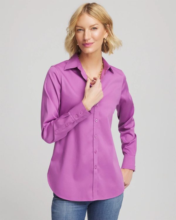 Our instantly bestselling No Iron™ shirt showcasing the season’s most coveted hues. We can’t keep our classic-fit No Iron™ stretch-sateen shirts in stock. This ready-to-wear right out of the dryer (without the hassle of ironing) top moves with you effortlessly for all-day comfort. It’s a straight silhouette with a point collar. Flawless every time in any season, whether on its own or as a base layer. Designed with a flattering shirttail hem and gusset featuring our CC Chico’s logo. This button front pairs perfectly with jeans or pants.