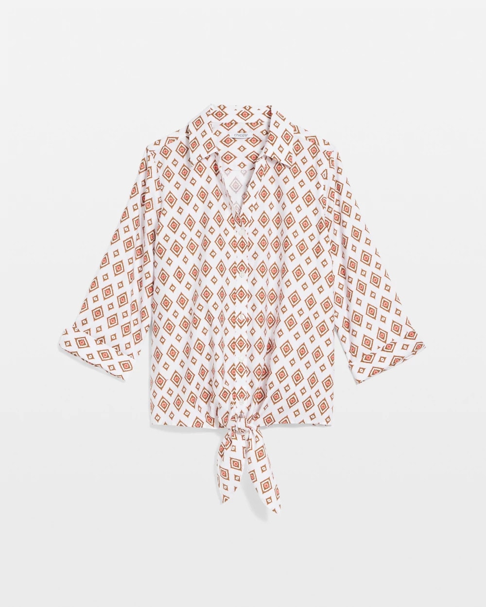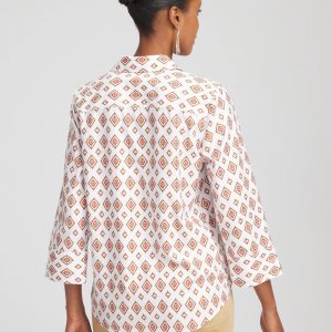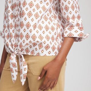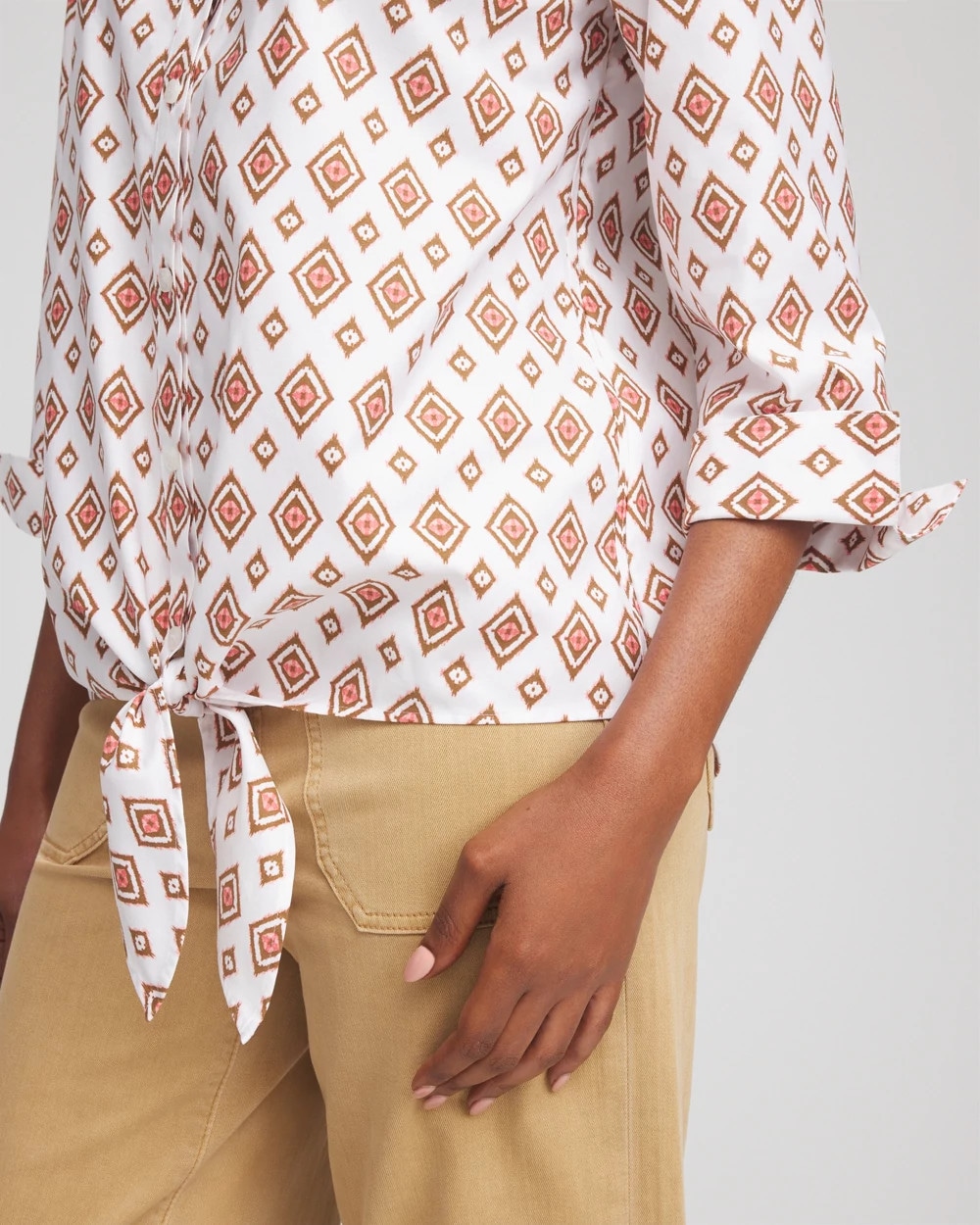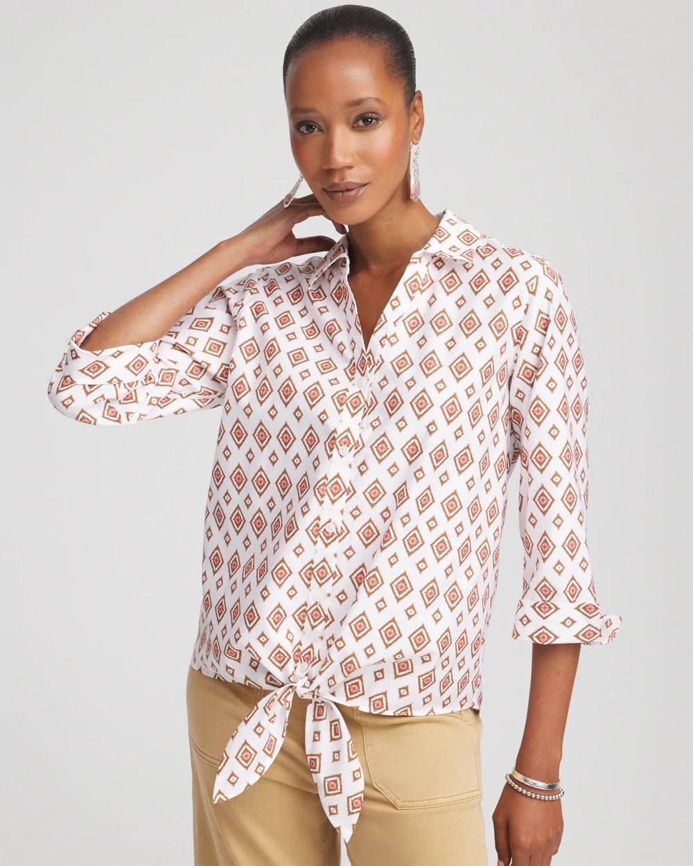 Our instantly bestselling No Iron™ shirt showcasing a geo-print motif. We can’t keep our classic fit No Iron™ stretch-sateen shirts in stock. This ready-to-wear right out of the dryer (without the hassle of ironing) top moves with you effortlessly for all-day comfort. It’s a straight silhouette with a point collar. Flawless every time in any season, whether on its own or as a base layer. Designed with a stylish tie-front and gusset. This button front pairs perfectly with jeans or pants.