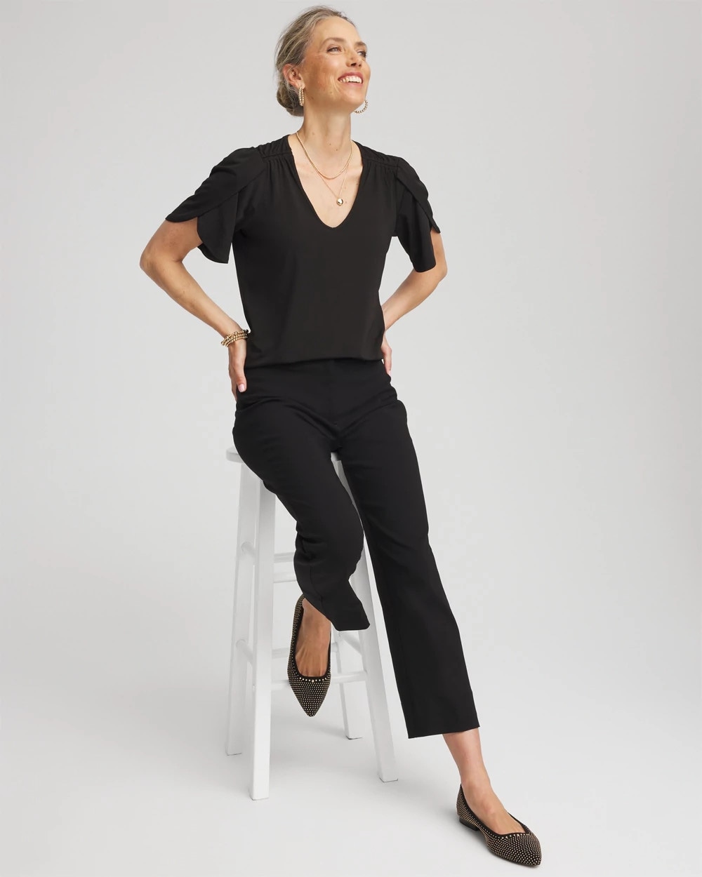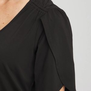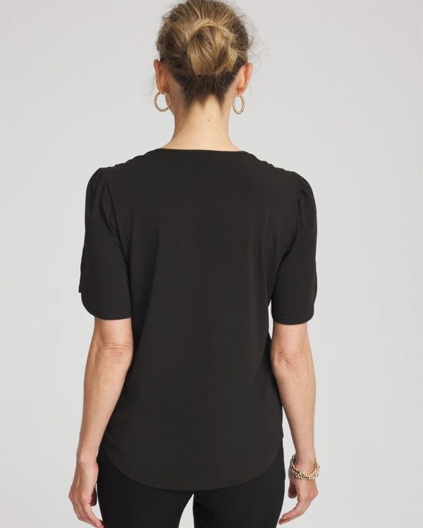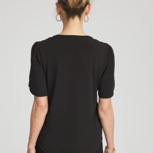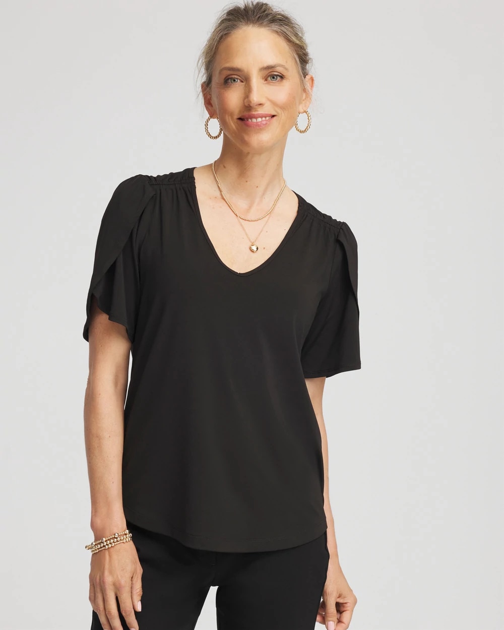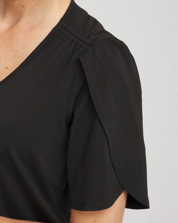 Cut for a casual-fitting silhouette and crafted with soft jersey knit, this fashion-forward tee is defined by short petal sleeves and a voop neckline. Detailed with an eye-catching floral motif to complete the style, showcasing pretty tonal pink flowers against a chocolate backdrop.
