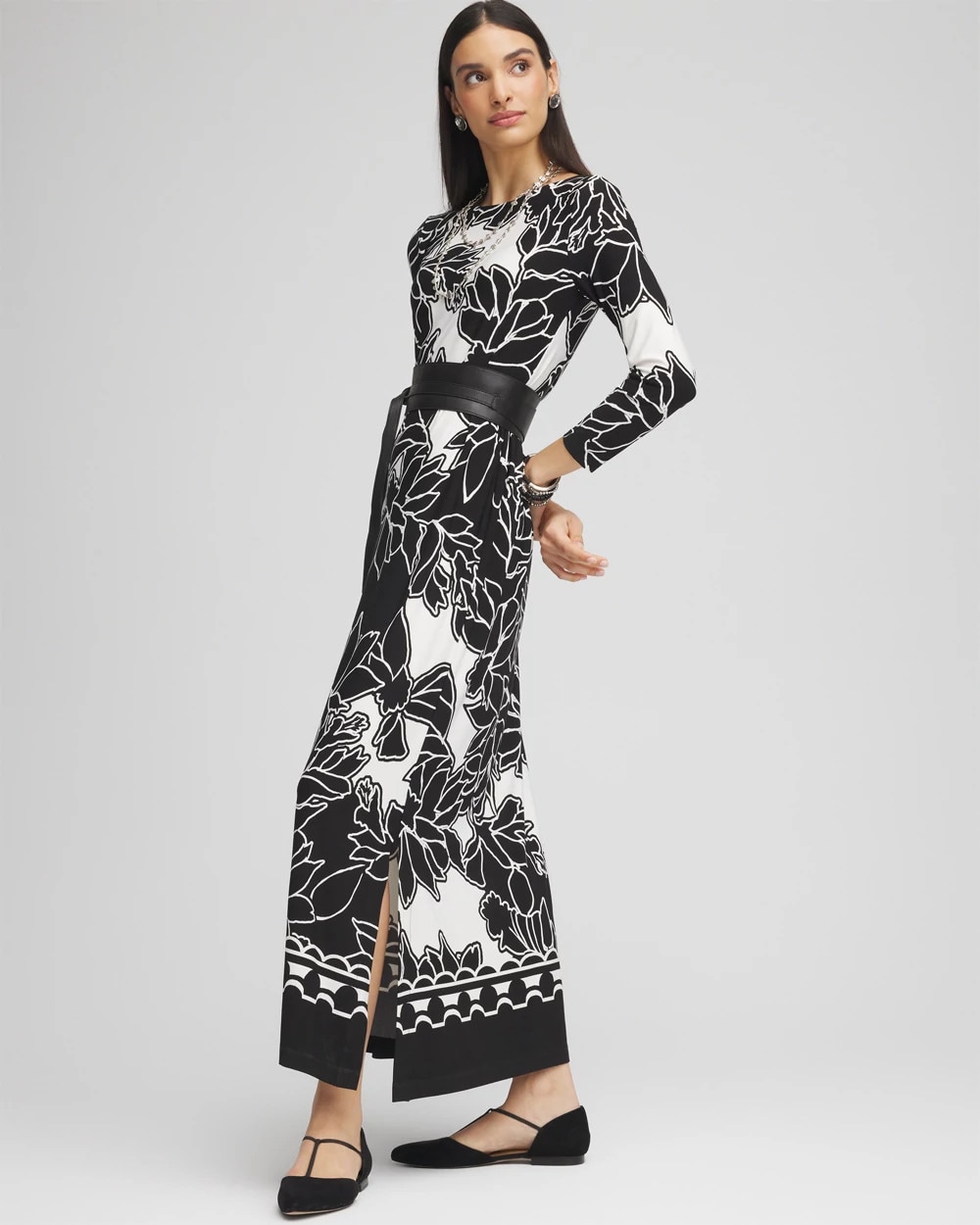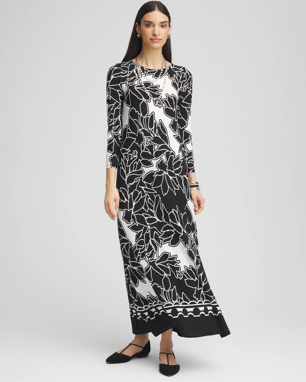 Add this new stunning style to your dress wardrobe, Chico’s Bateau-Neck Jersey Maxi Dress features a printed border hemline, flattering maxi silhouette, side-slit, and long sleeves.