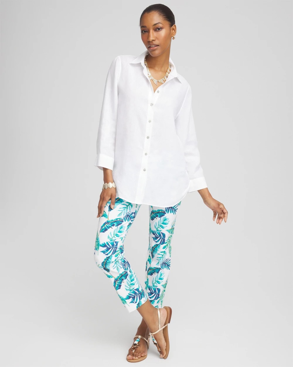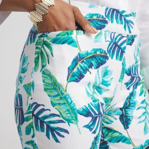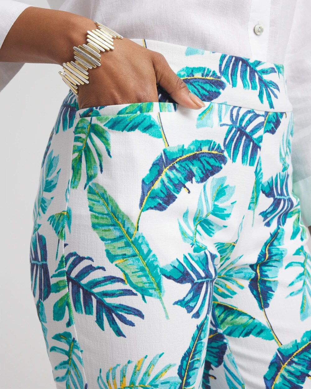 This new iteration of our Brigitte™ Cropped Pull-On Pants feature a slim leg and cropped silhouette with a stunning tropics-inspired palm tree motif. Featuring Chico’s signature So Slimming® built-in shaping solution, extending 180 degrees around you, sculpting and smoothing your shape for a flattering look, and angled front pockets to enhance the effect. The rise sits just below the natural waist, offering comfort and style for festive or everyday wear.