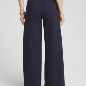 - Relaxed fit; button and fly front, elastic back waistband, wide leg, full length.
