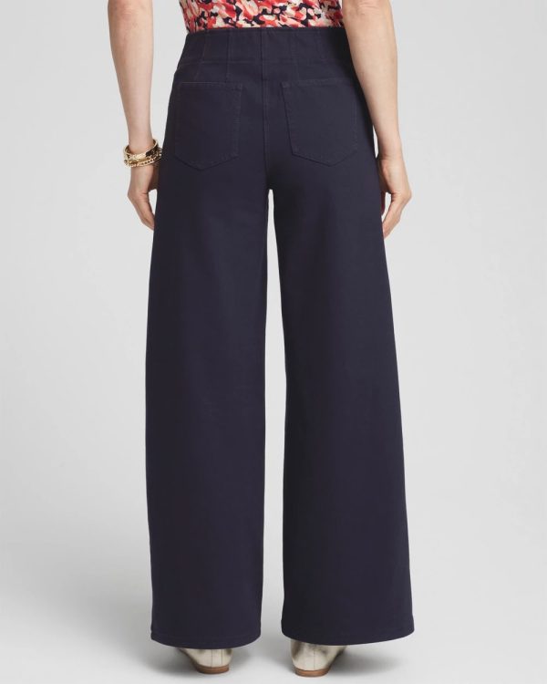 - Relaxed fit; button and fly front, elastic back waistband, wide leg, full length.