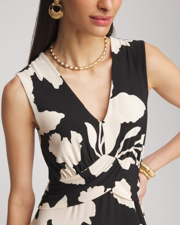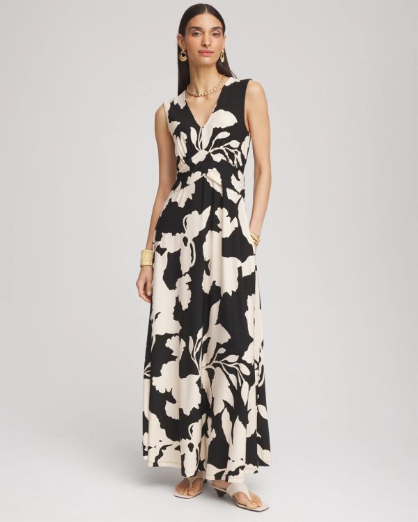 An essential dress, elevated and made utterly stunning, Chico’s new Ruched Jersey Maxi Dress. Showcasing a full-ruched front placket and expertly crafted floral design. Featuring a flattering fit, sleeveless A-line silhouette, and v-neckline with alined front and back bodice.
