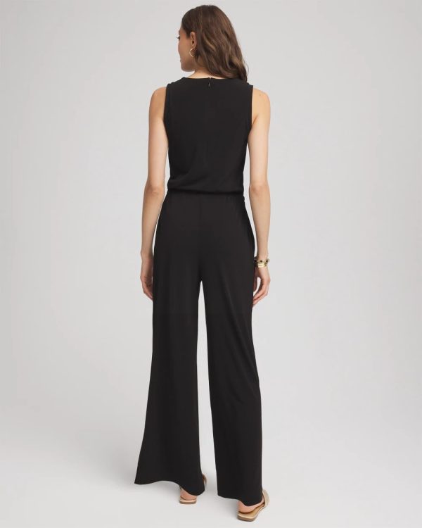 Crafted for a fluid wide-leg silhouette, this Travelers™ jersey knit jumpsuit is an elevated wardrobe essential.Bias cut from lightweight stretch-knit fabric for a beautiful drape that offers ease of movement and hugs the body’s curves in a way that creates a slinky and flattering silhouette. Smoothing, shaping back darts. Featuring classic pant and dress elements including smoothing back darts, concealed back zipper, hook and eye closure, andgoldtone link-chain embellishment at the neckline for a luxurious finish.