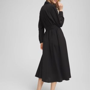 - Midi shirtdress; A-line skirt, fully-lined, collared, belted design with roll-cuff sleeves, and breast pockets.