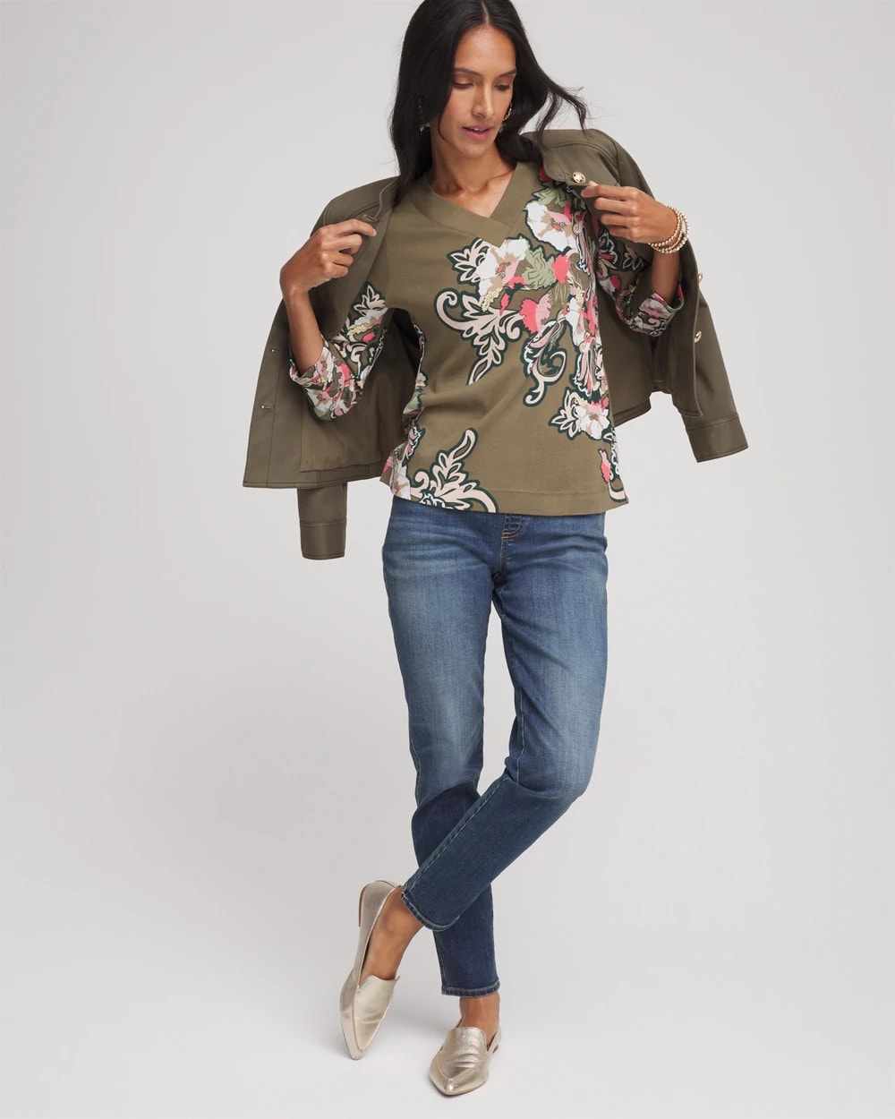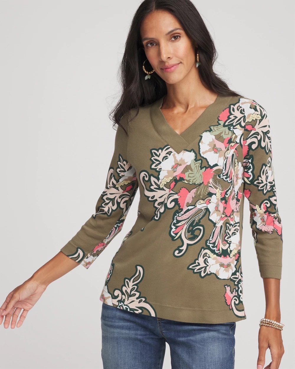 - Classic-fit 3/4 sleeved v-neck tee.