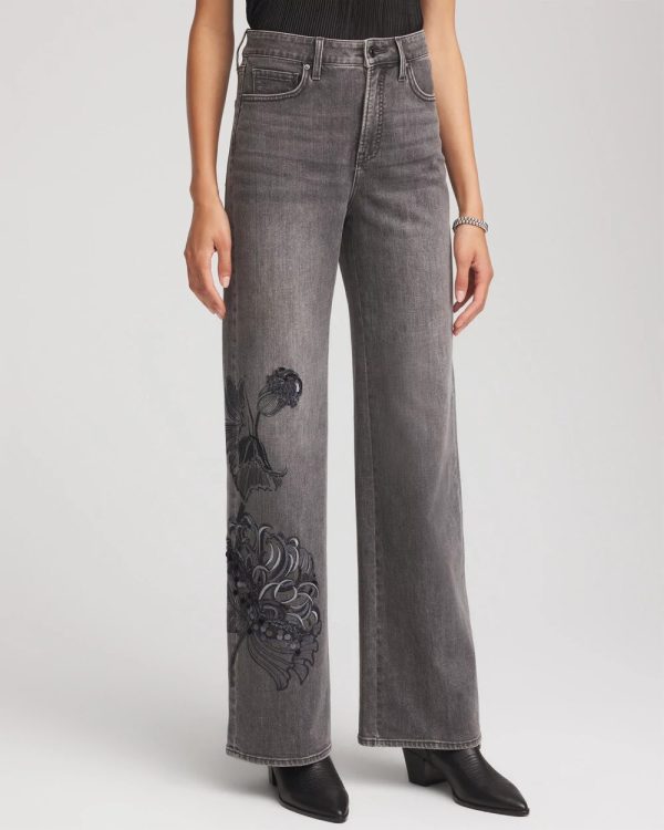 Made with a gray wash denim showcasing vintage character—washed for a white hue and treated with grinding appeal. These high-rise jeans are cut for a wide-leg silhouette and feature an artisinal floral print meticulously placed on the right leg. Featuring a tummy slimming interior that lifts and shapes your figure, courtesy of Chico’s proprietary So Slimming® technology.