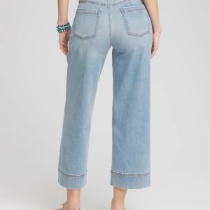 Designed with a pull-on Hollywood waist accented with the ultimate in comfort, flattering seaming details, and a faux front button. Showcasing a lightwash denim. These jeans feature our wide-leg fit that’s roomier and so in style, plus angled front pockets for a sleek silhouette.