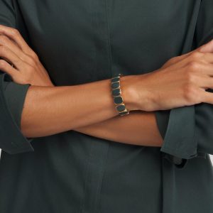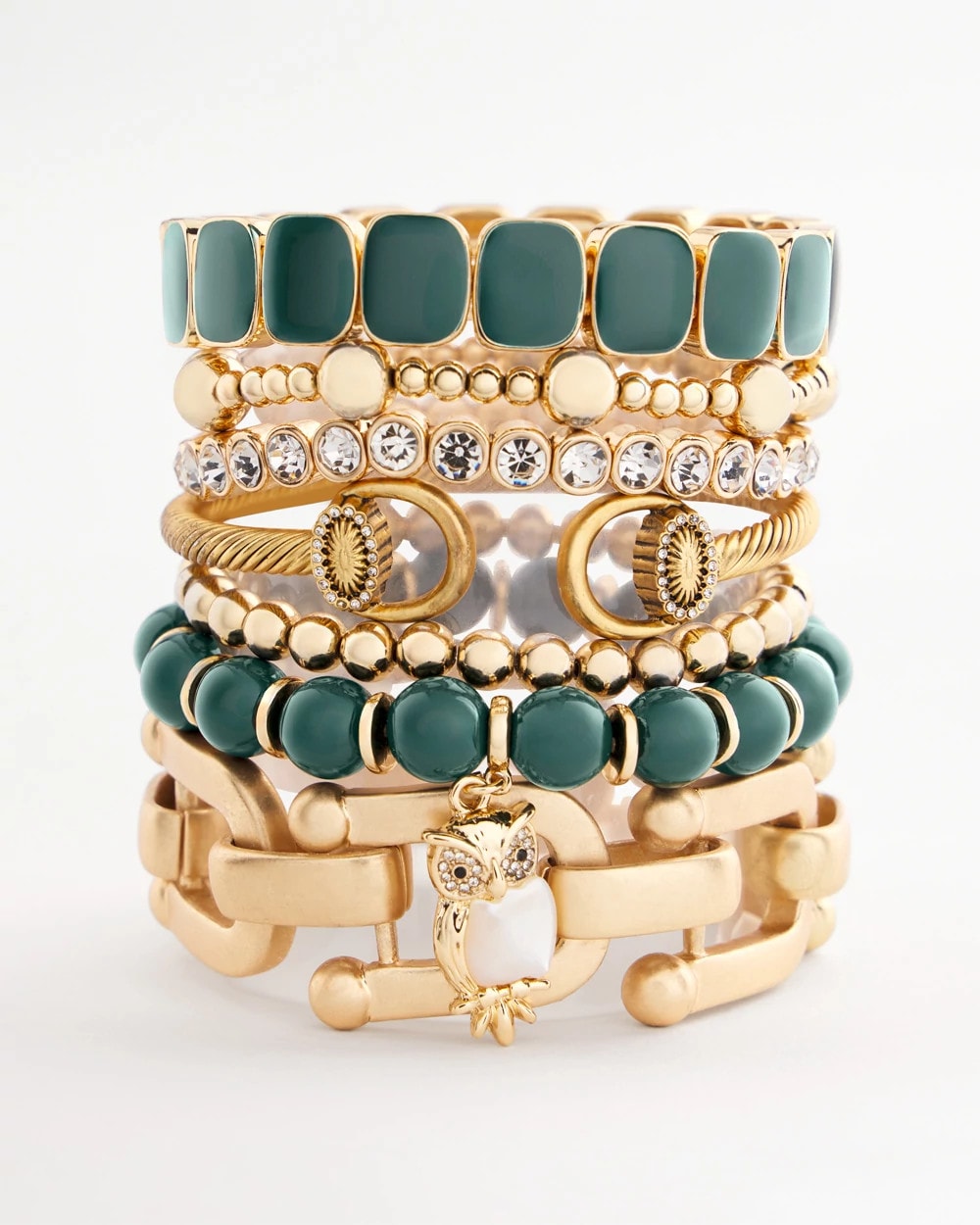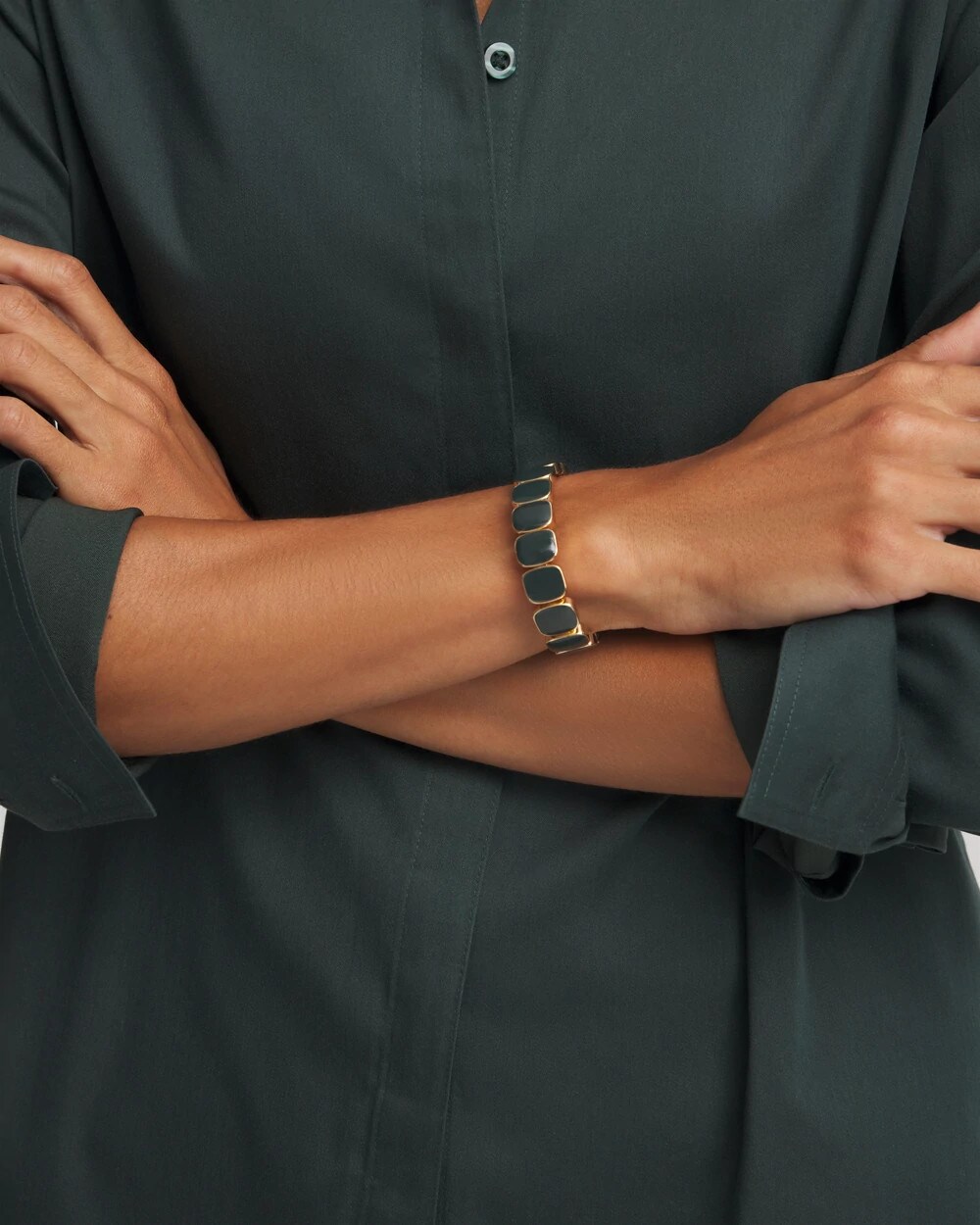 Shades of green lined with gold tones that will bring envy, this Resin Goldtone Square Stretch Bracelet is perfect for pairing with your Chico’s Tennis Bracelets and other stretch bracelets in gold tones.