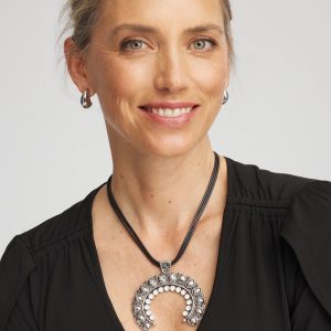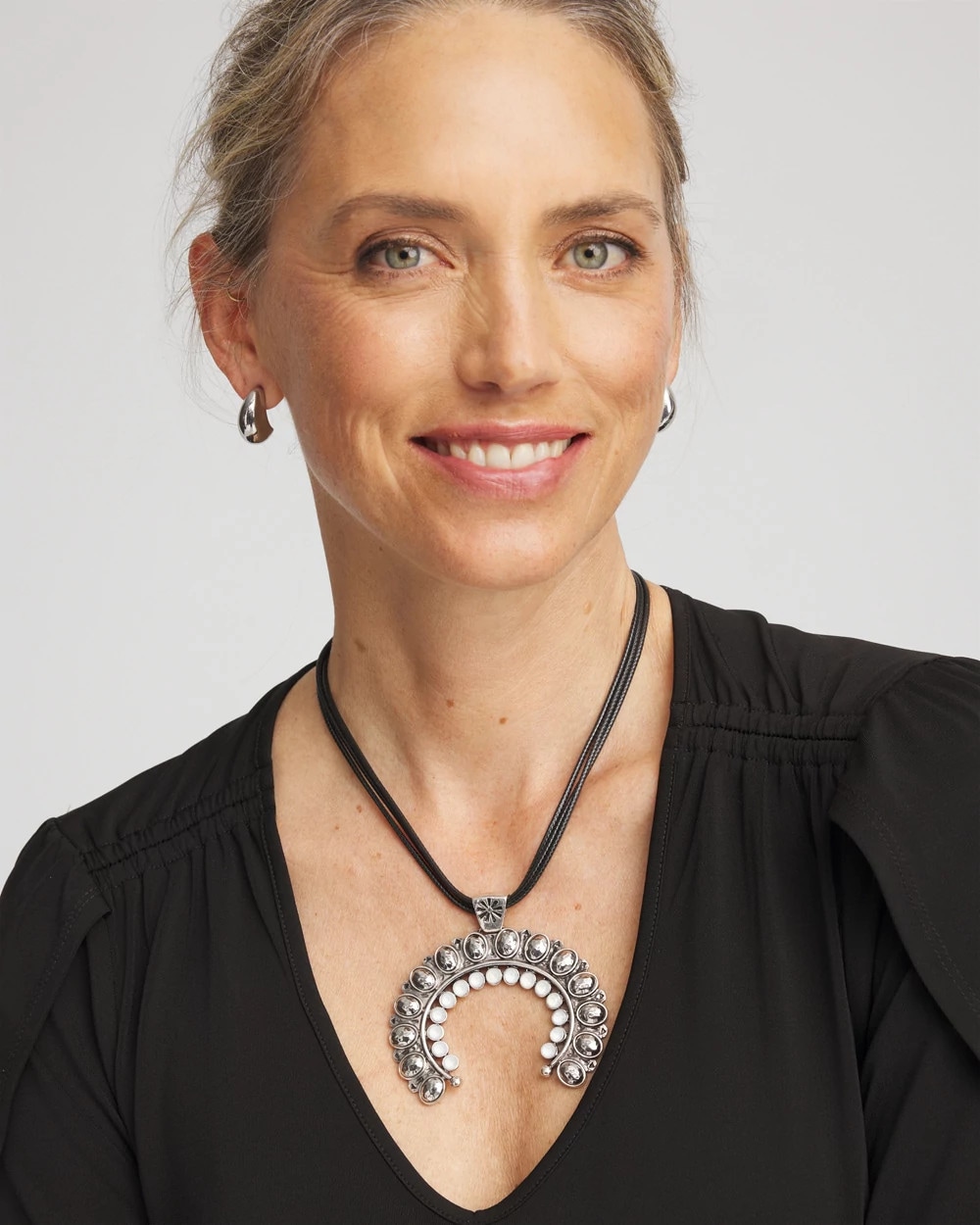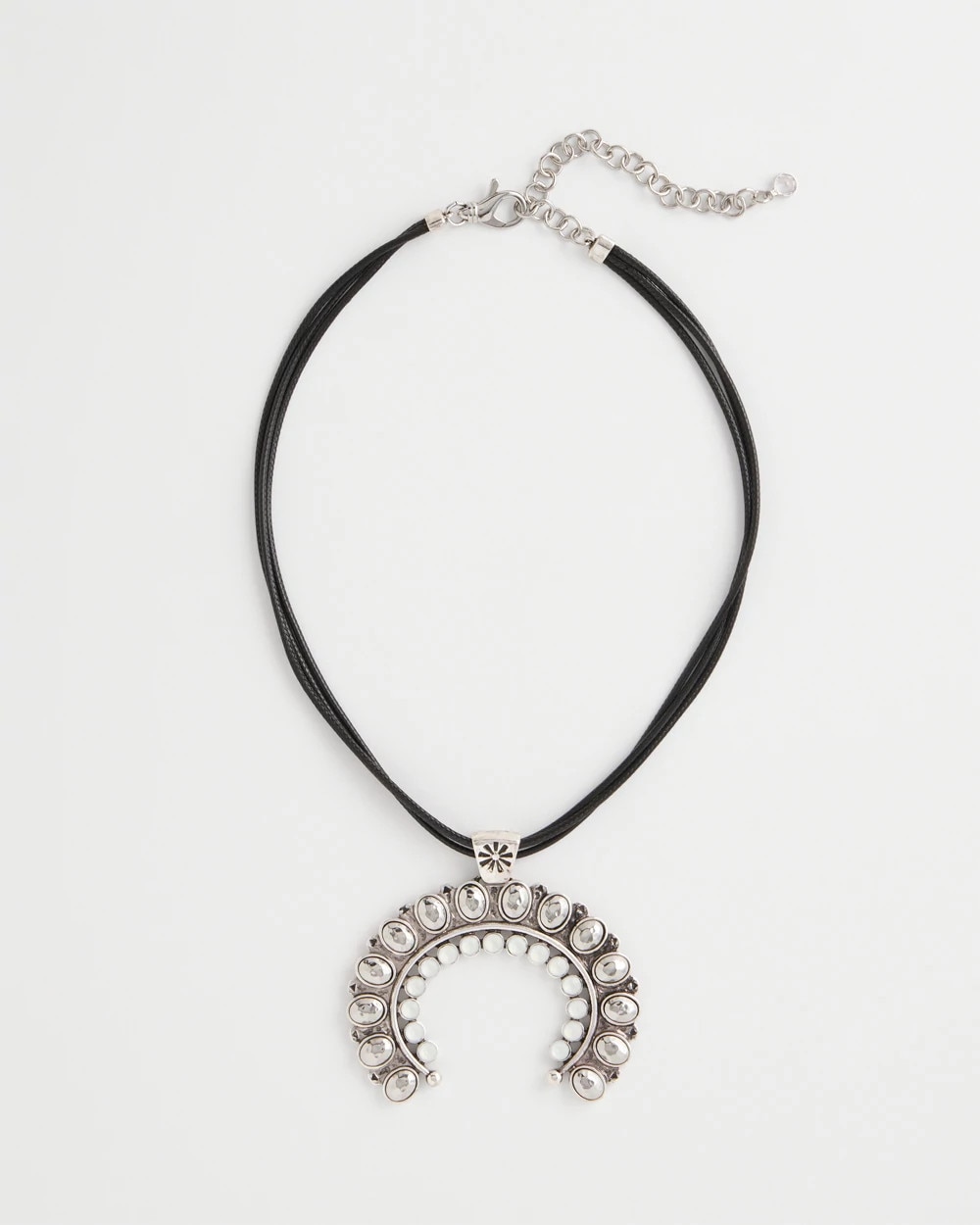 Pair with the season’s western motif jewelry, fashion, and accessories. A stunning horseshoe pendant on a cord necklace.