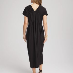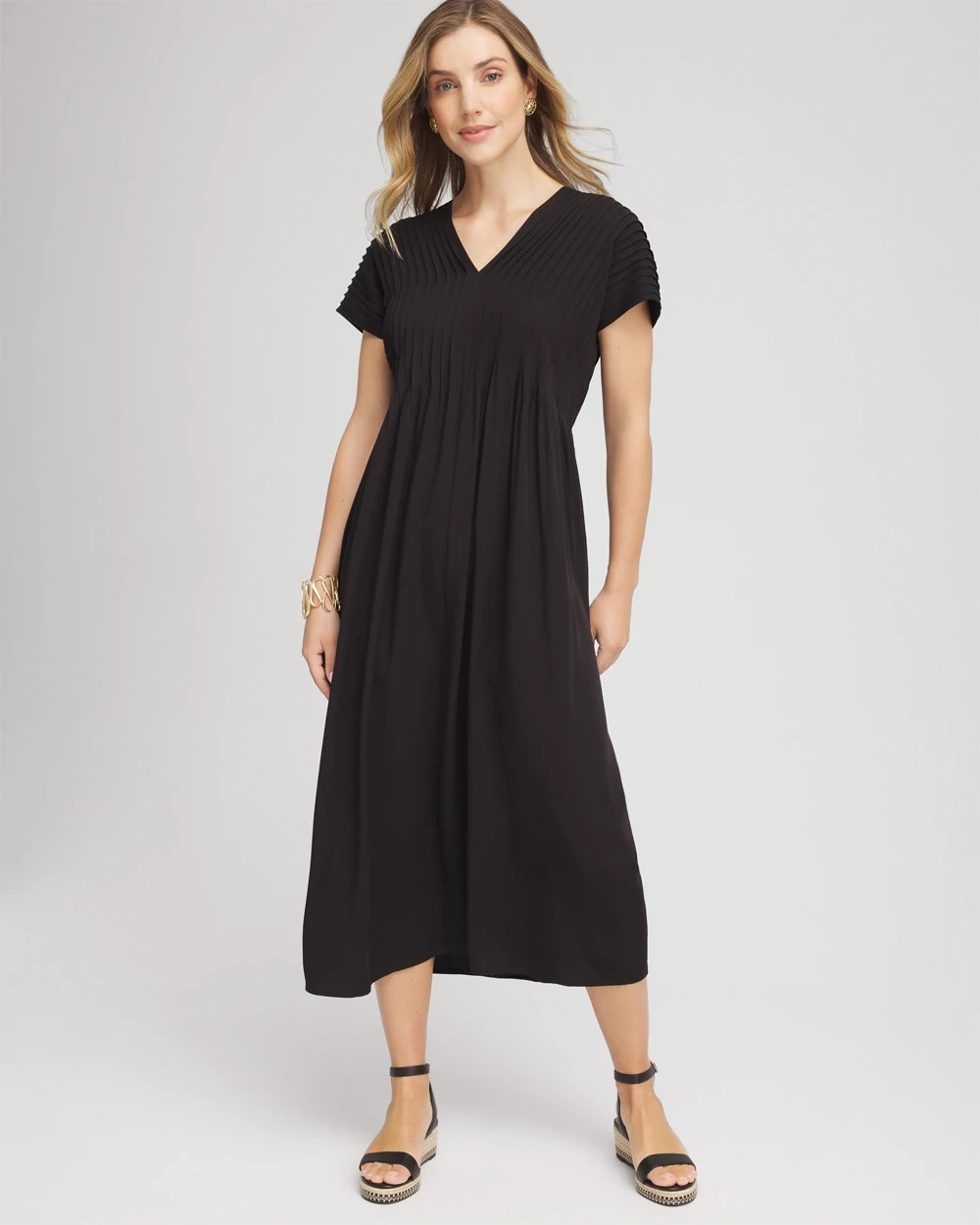 This dress integrates a pintuck bodice, complete with a v-neckline and cap sleeves, and a flowing, silky soft drape.
