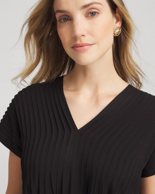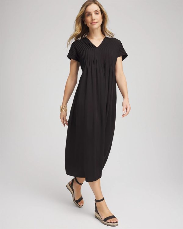 This dress integrates a pintuck bodice, complete with a v-neckline and cap sleeves, and a flowing, silky soft drape.