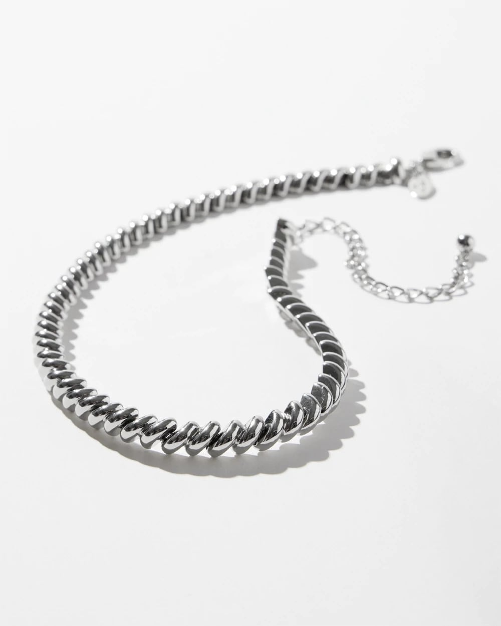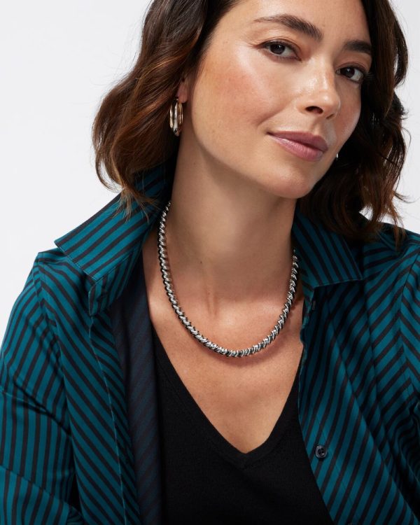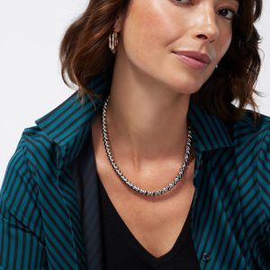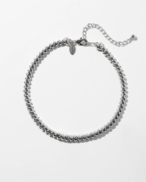 The Silver Tone Twist Collar Necklace is fun and sophisticated. This accessory features a twist silver tone chain that’s perfect for adding subtle charm. Wear it dinner parties, dates, and holiday celebrations.