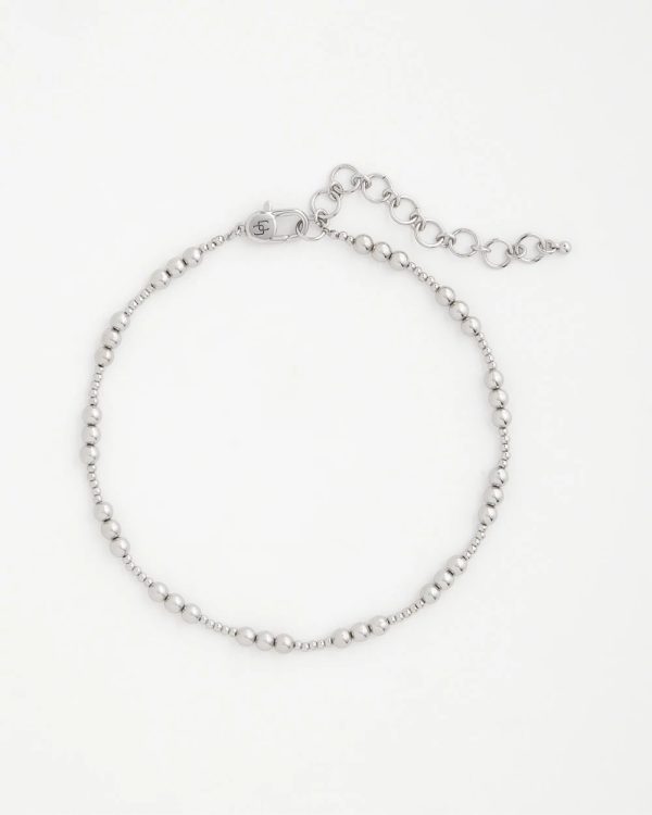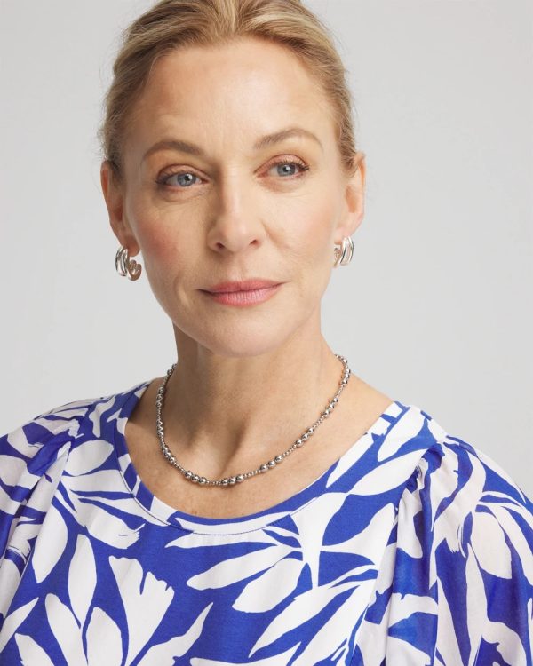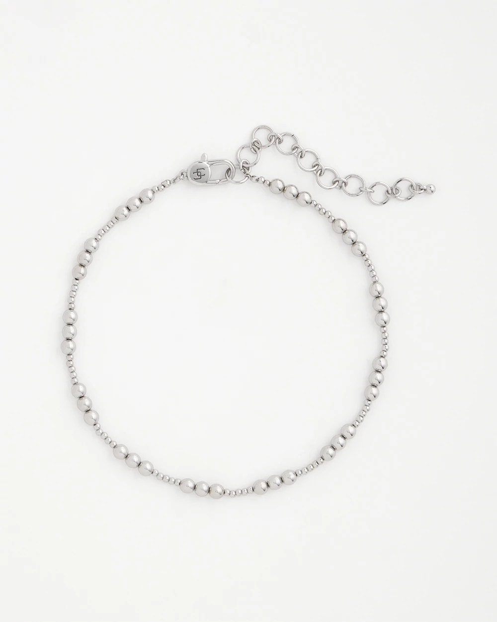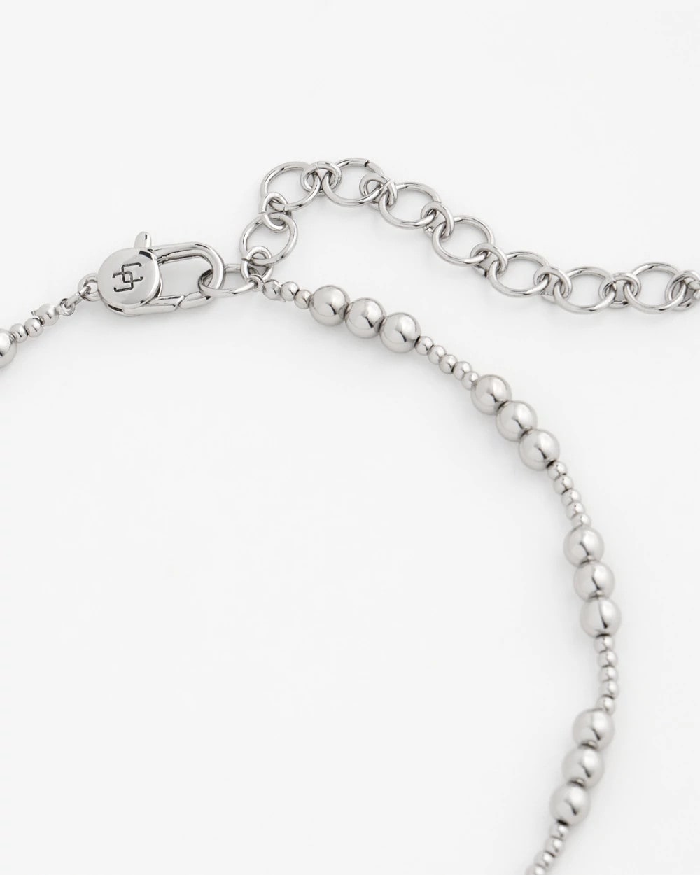 This gorgeous silver-beaded necklace is just the elevated essential style you need. Sits right at the collarbone at 15 inches, featuring Chico’s CC logo lobster claw closure with a dainty ‘American diamond’ cubic zirconia, and 4 inch extender. The perfect silvertone first layer necklace or a glamorous piece that looks stunning all on its own. The silver beads showcase three larger beads followed by five smaller ones for a dimensional effect.