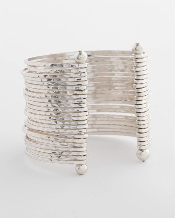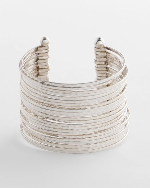 This sleek bracelet features a combined stack of silvertone slivers to create one large classic cuff. Whether dressing for vacation or casual daily wear, add Chico’s Sea Glass Silver Collection.