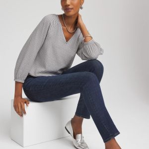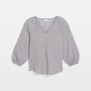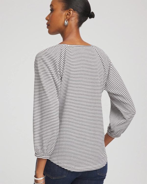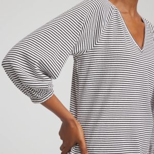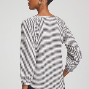 A face-framing v-neckline and jersey knit fabrication help define this elevated staple Striped Crinkled Raglan Top.