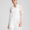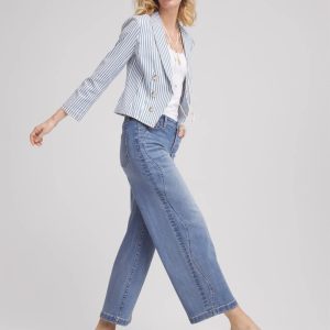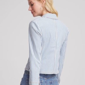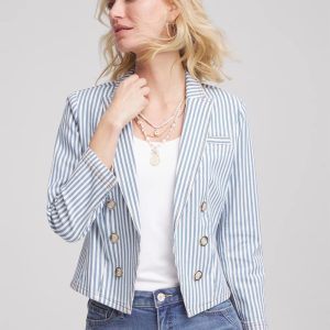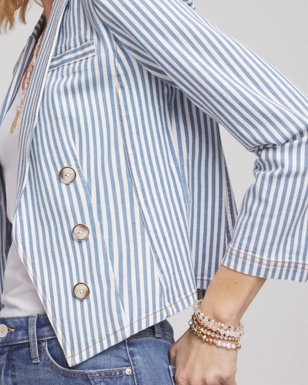 Showcasing a series of special design techniques, this new denim jacket silhouette recreates a buttoned-down, double-breasted blazer effect. Open front, for-style neutral buttons. Collared with gentle lapels and a soft-blue striped motif. Pairs beautifully with matching alabaster and jeans.