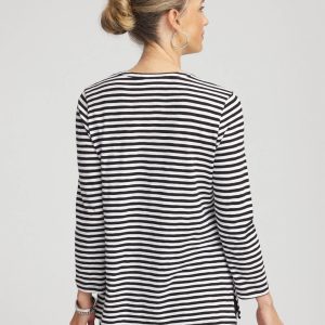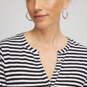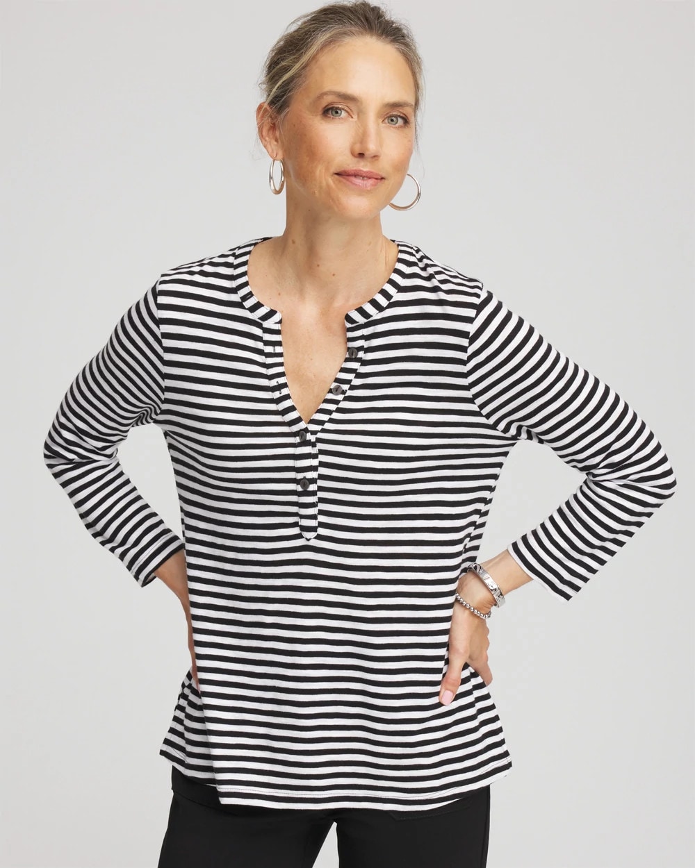The bestselling Slub Split-Neck Henley Tee, featuring a timeless striped print embodying the beauty ofexquisitestyle through simplicity. Offering elbow sleeves with stylish shirring and a face-framing split neckline. Cut from Chico’s coveted slub fabric for a soft feel and luxurious look. The perfect tee for a stunning necklace or earrings.