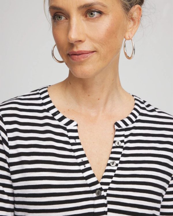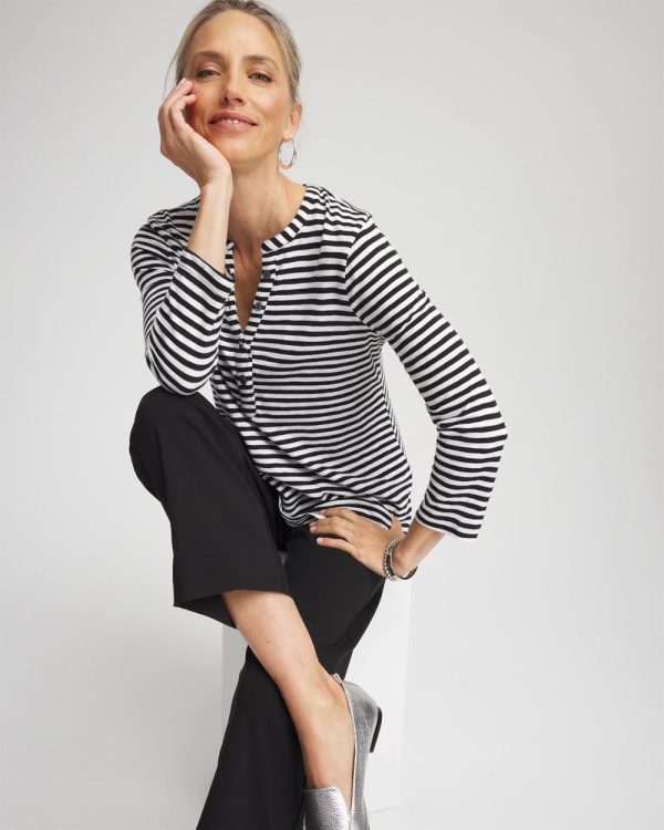 The bestselling Slub Split-Neck Henley Tee, featuring a timeless striped print embodying the beauty ofexquisitestyle through simplicity. Offering elbow sleeves with stylish shirring and a face-framing split neckline. Cut from Chico’s coveted slub fabric for a soft feel and luxurious look. The perfect tee for a stunning necklace or earrings.
