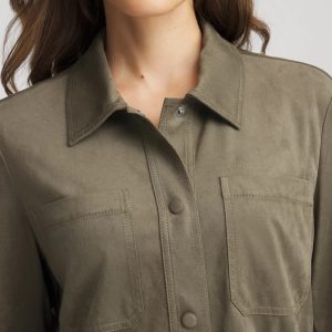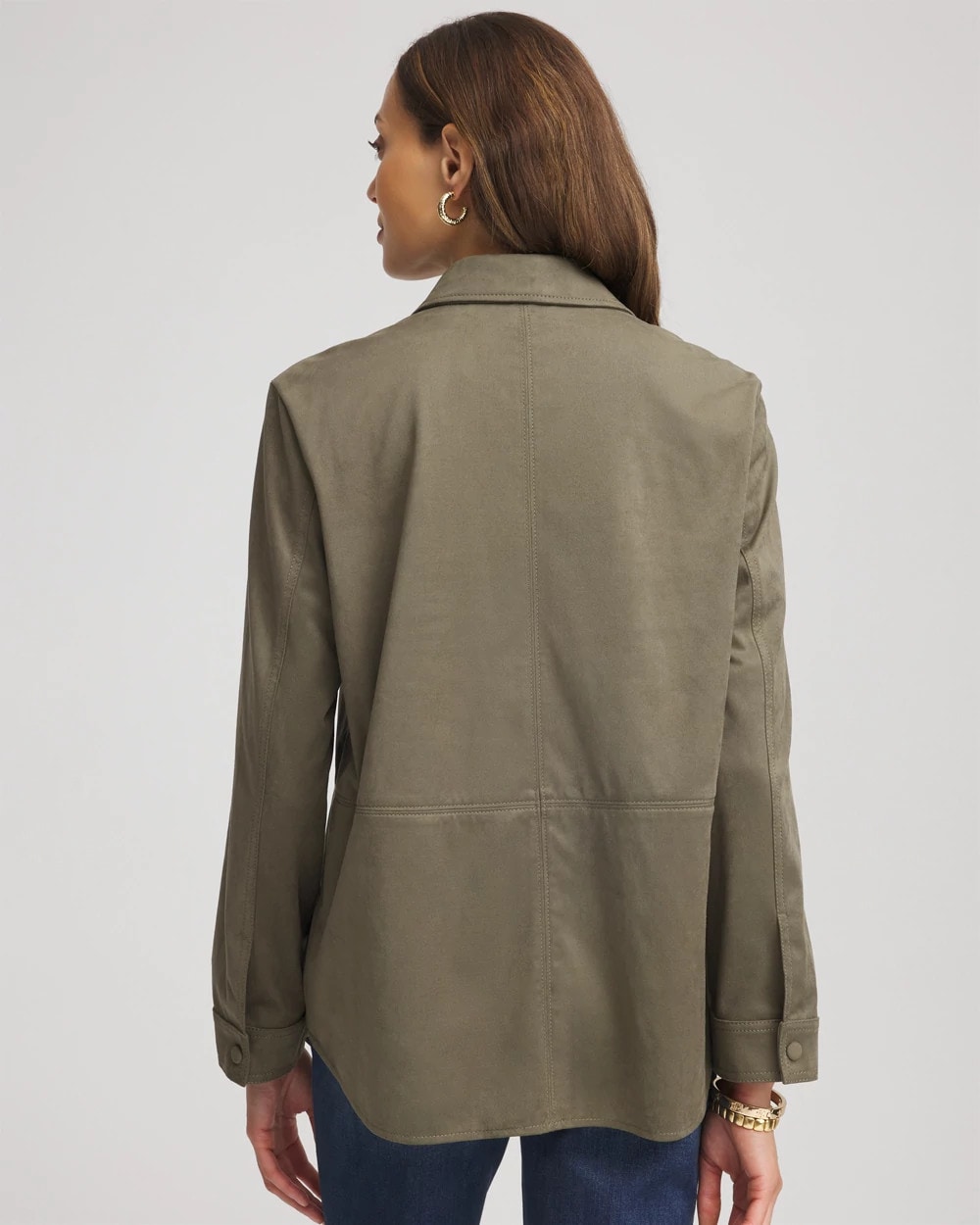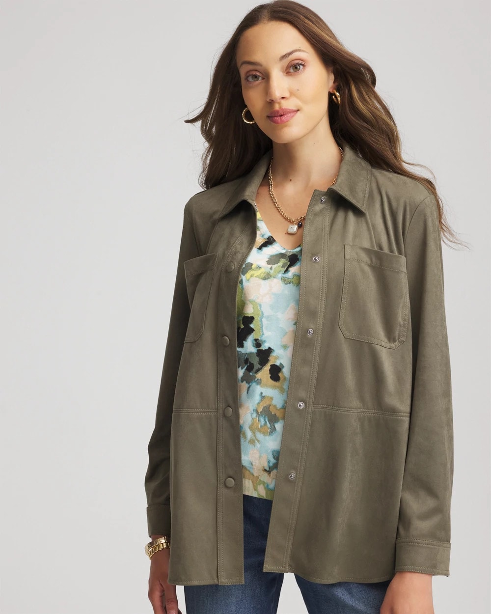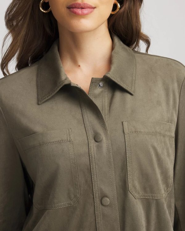Soft-stretch ponte suede, a shirttail hem, and top applied patch pockets help define this Suede Collared Long-Sleeved Shacket. Wear open as a jacket or button-up the sueded buttons and wear as a shirt.