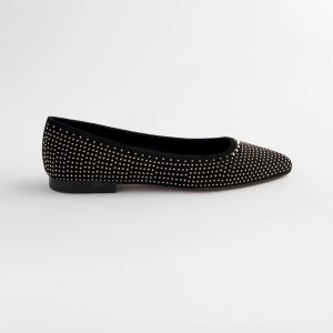 These flats are cut from soft black micro-suede, showcasing gold studded hardware all over for a more luxurious style.