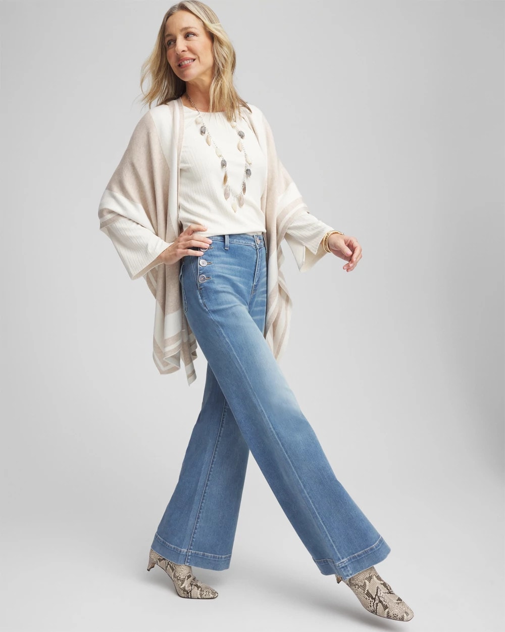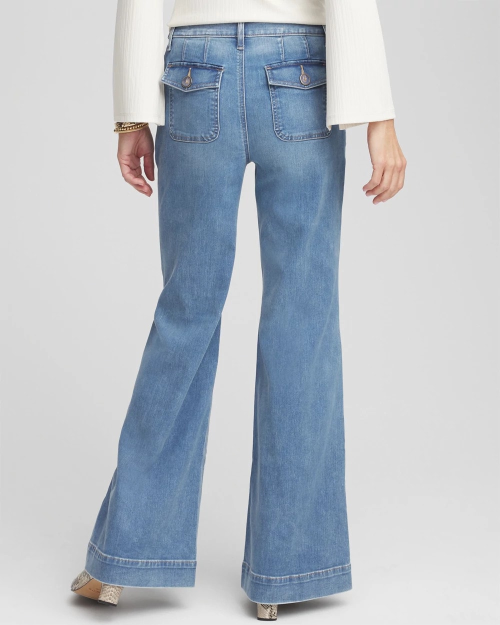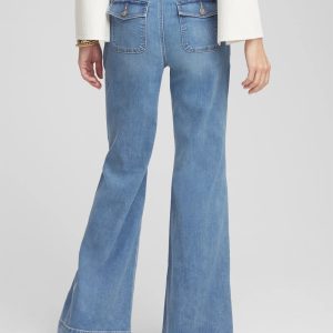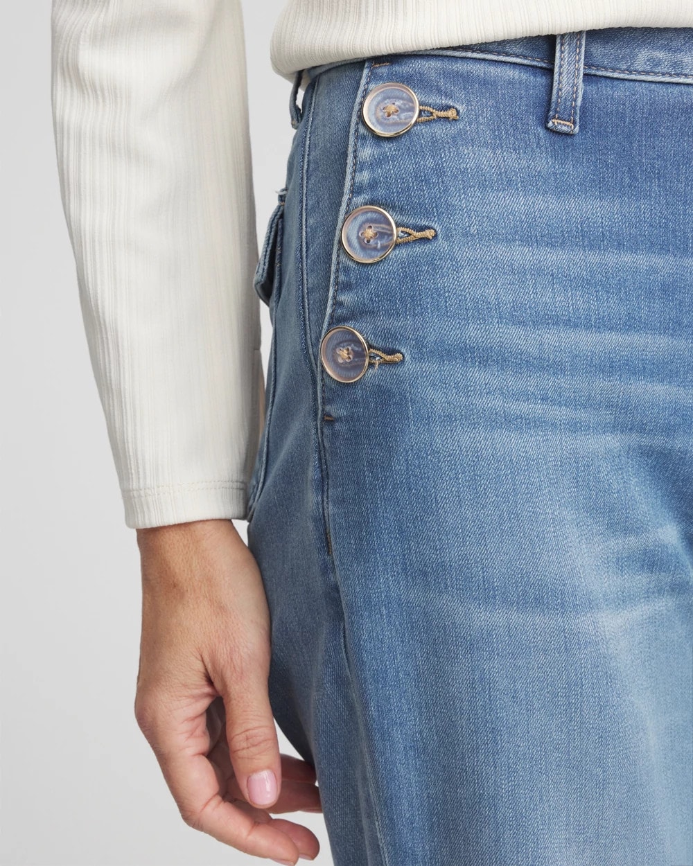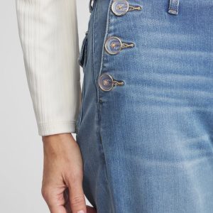 - Flare-leg jean; four-pocket design, fashionable buttons lining the front pockets.