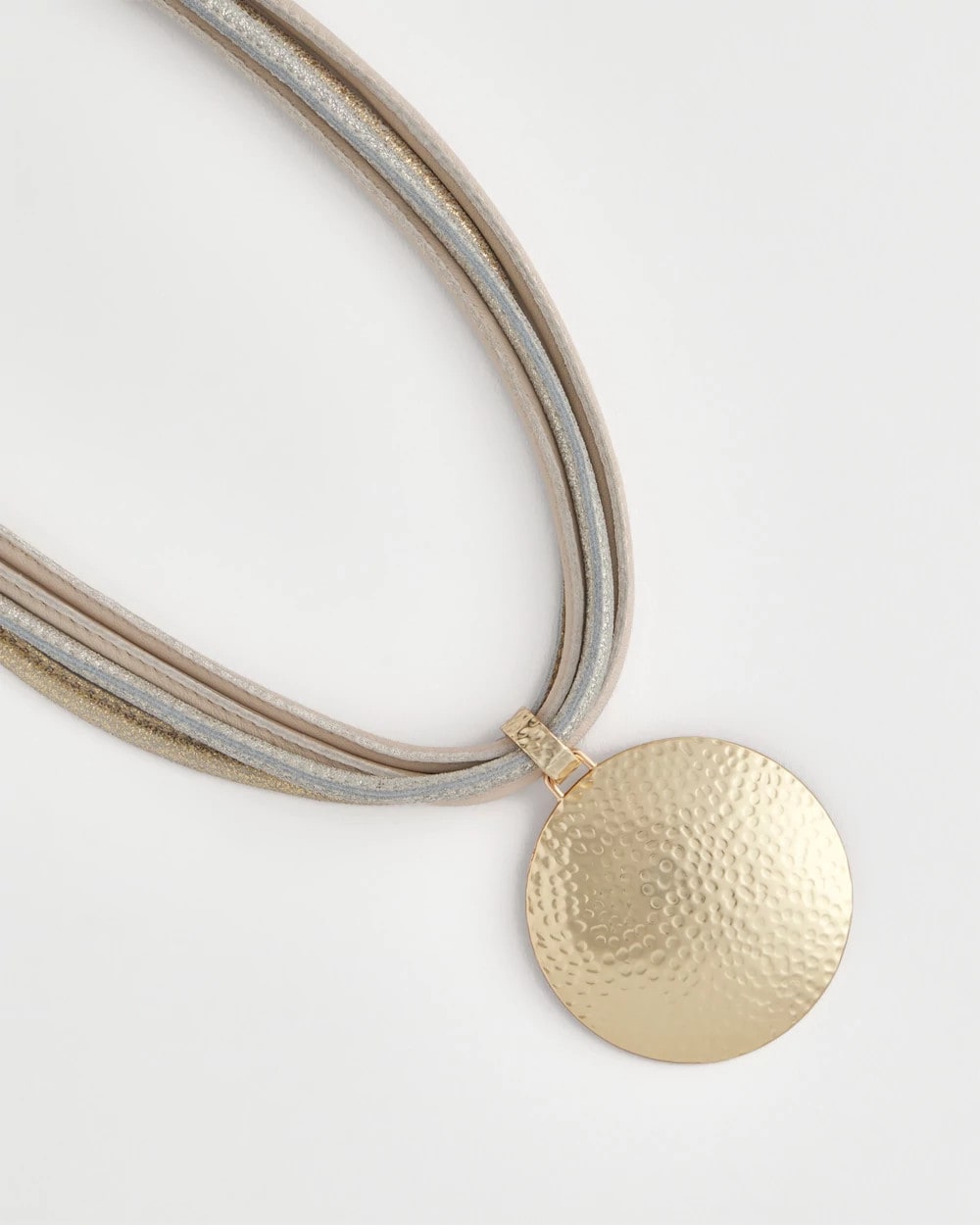Reimagine your pendant collection with this Textured Golden Pendant Necklace showcasing a mixture of rich metals and leather textures. Pair with its matching bracelet.