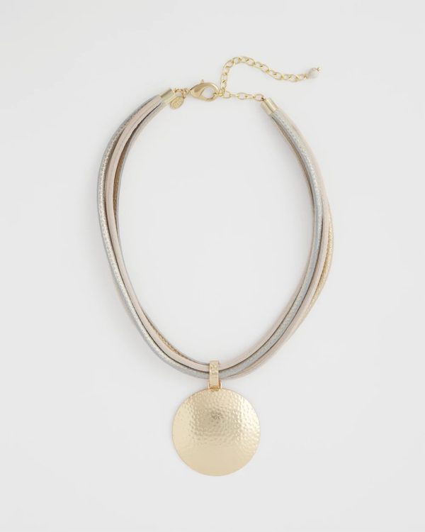 Reimagine your pendant collection with this Textured Golden Pendant Necklace showcasing a mixture of rich metals and leather textures. Pair with its matching bracelet.